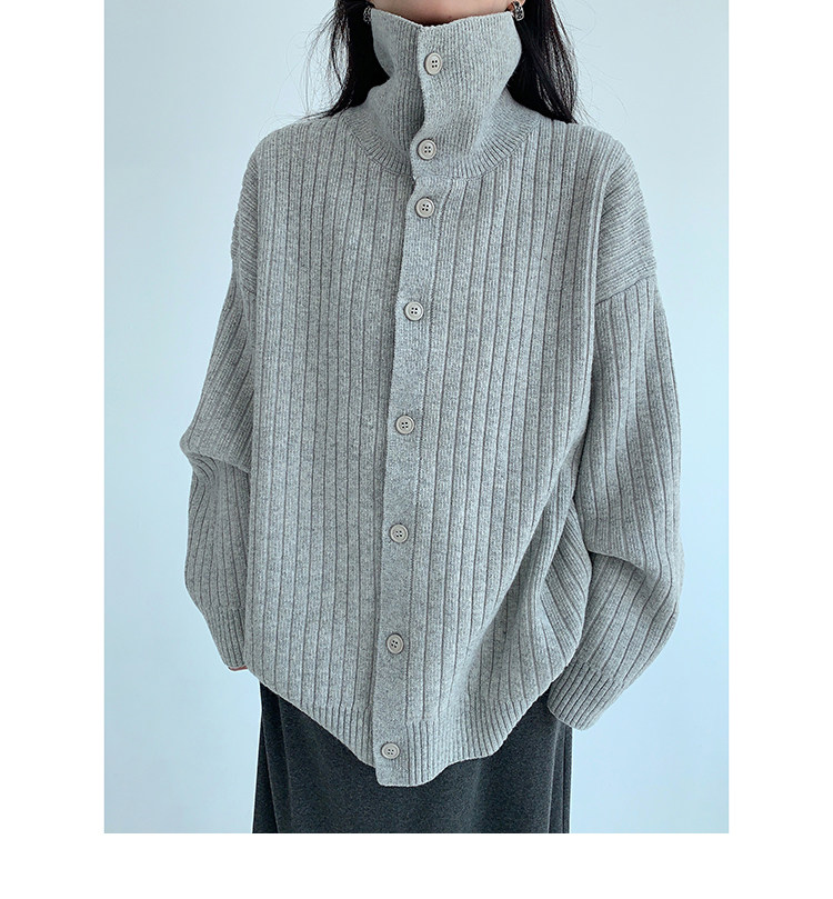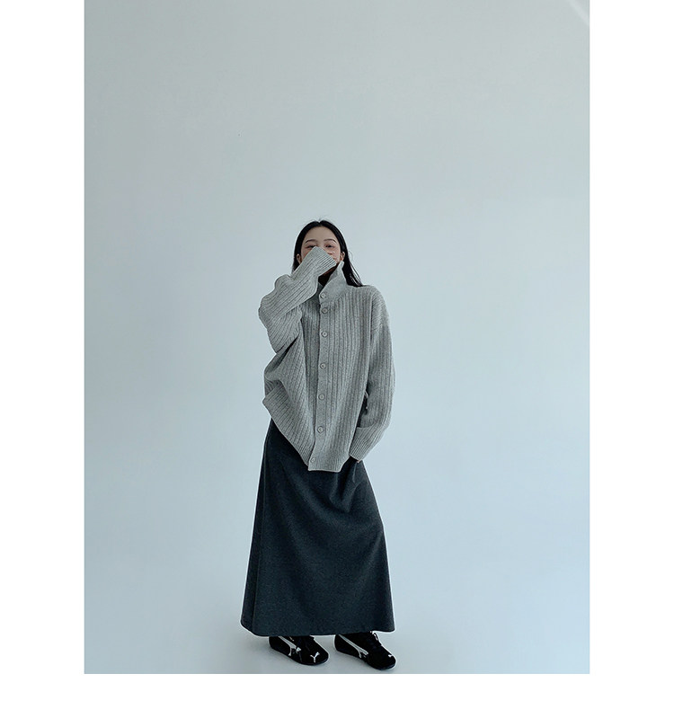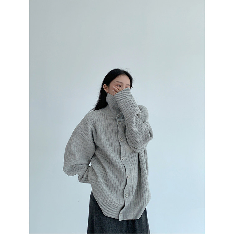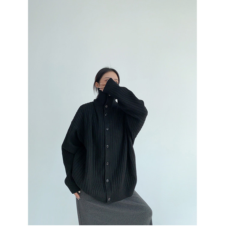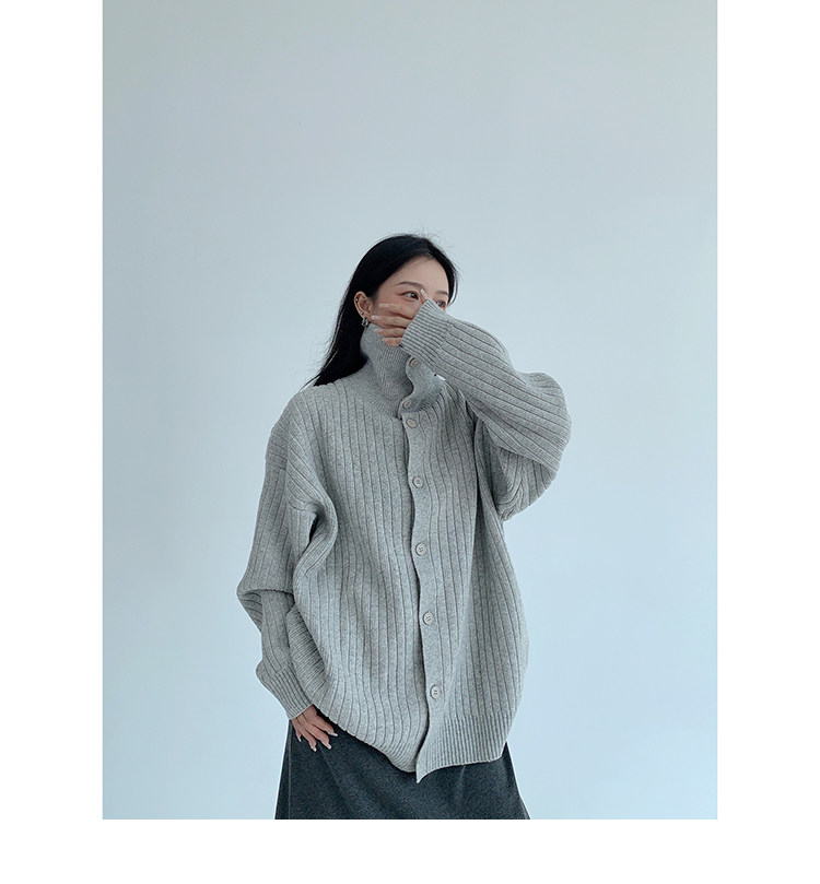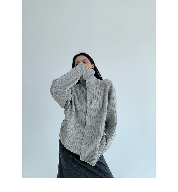 首元まで包み込むハイネック仕様が特徴のニットカーディガン。