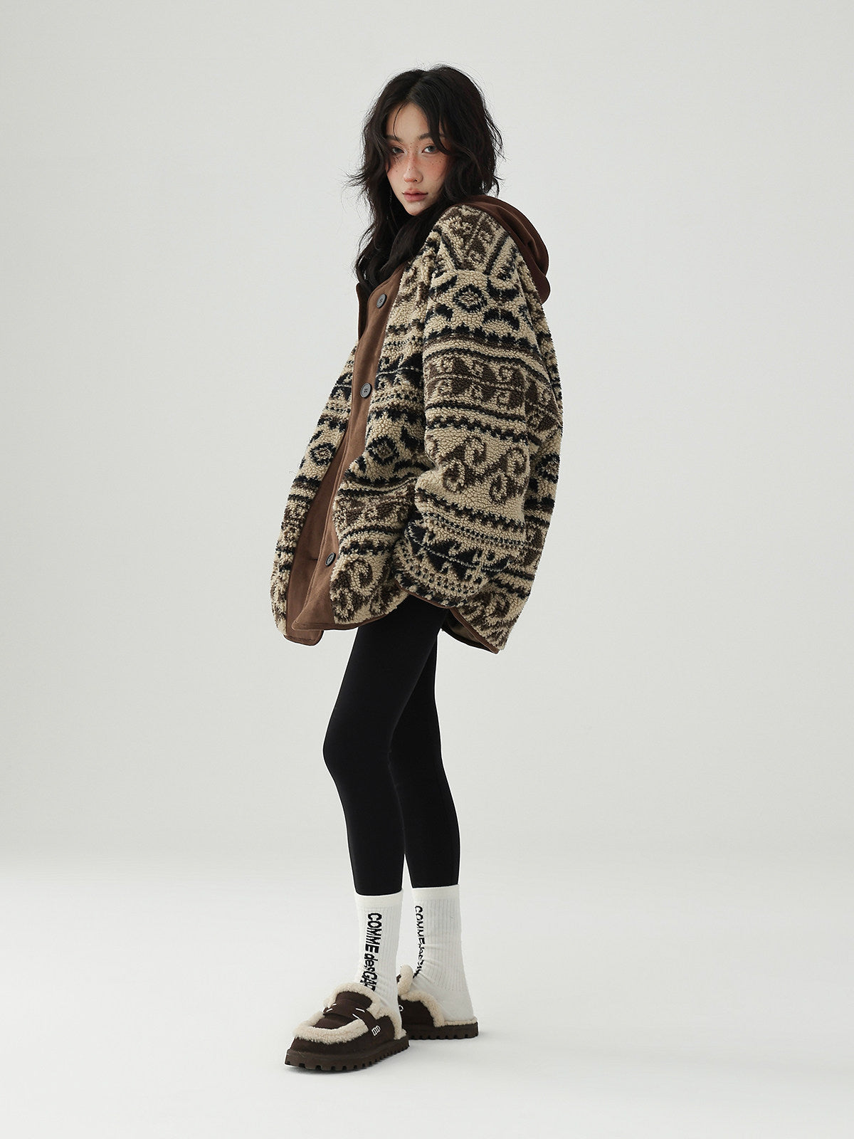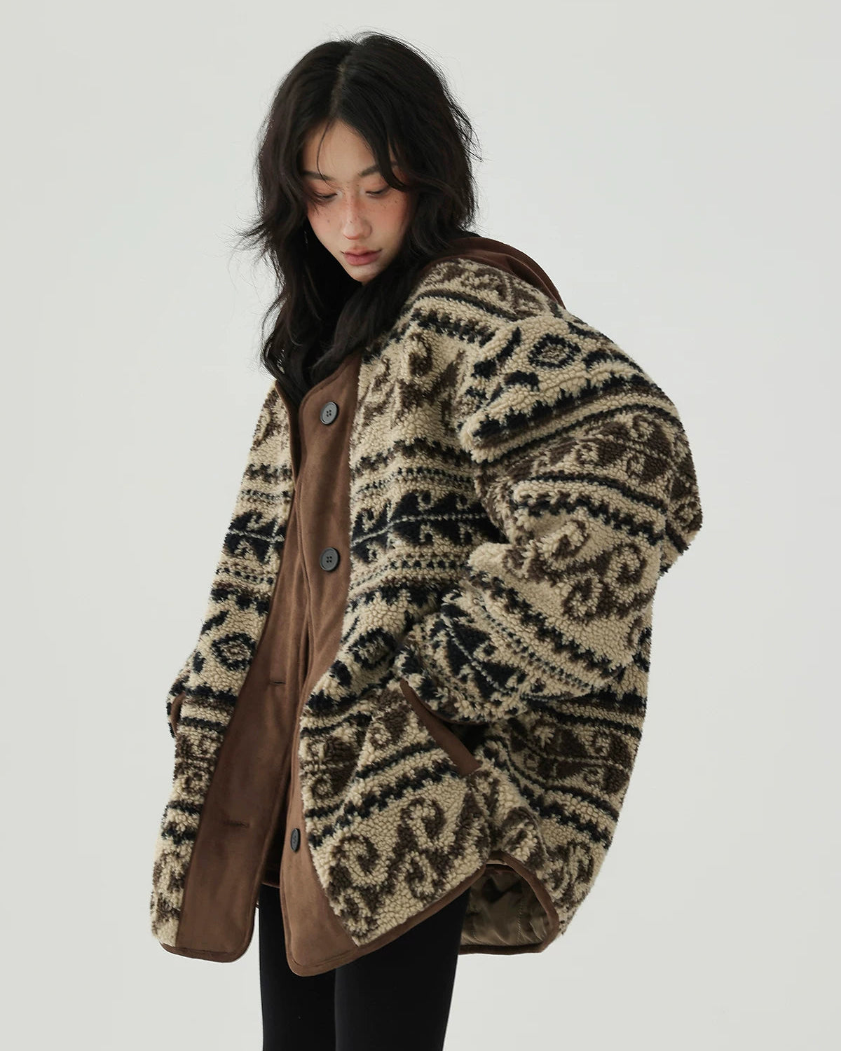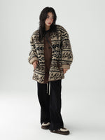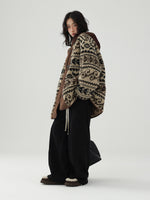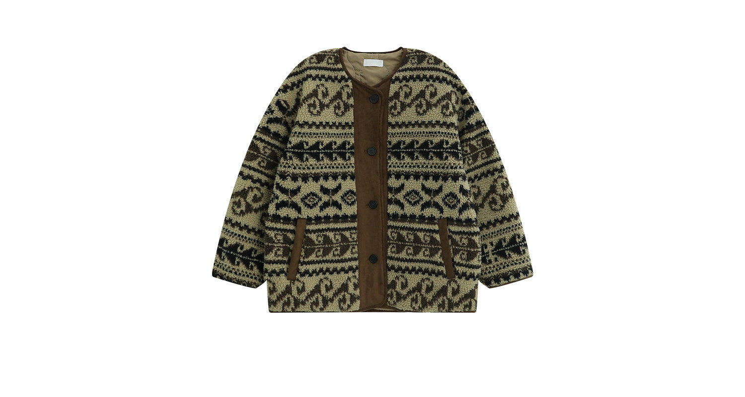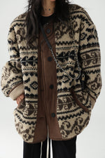 レトロなノルディック柄が冬のムードを高める、もこもこボアのニットカーディガン。