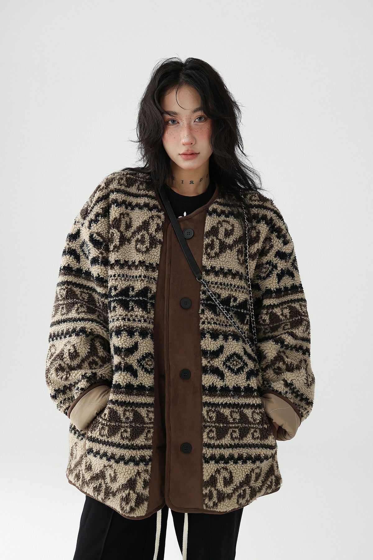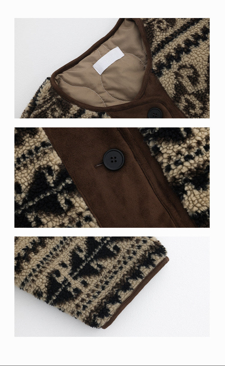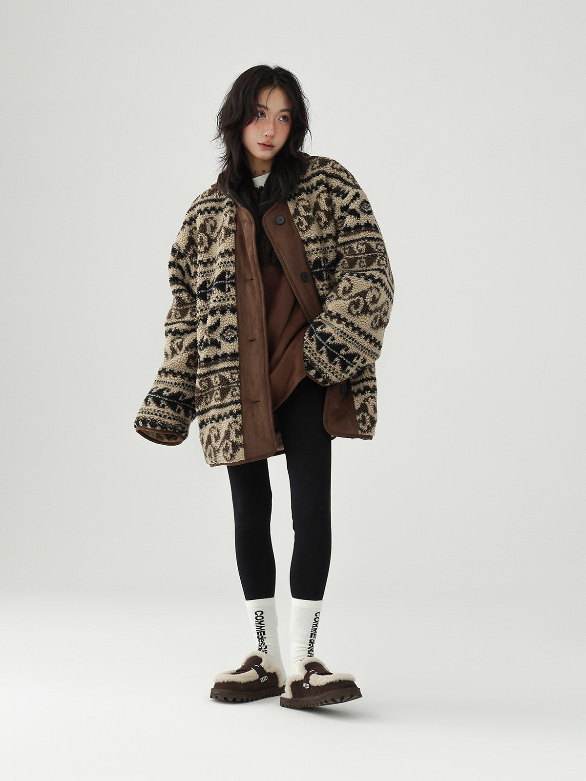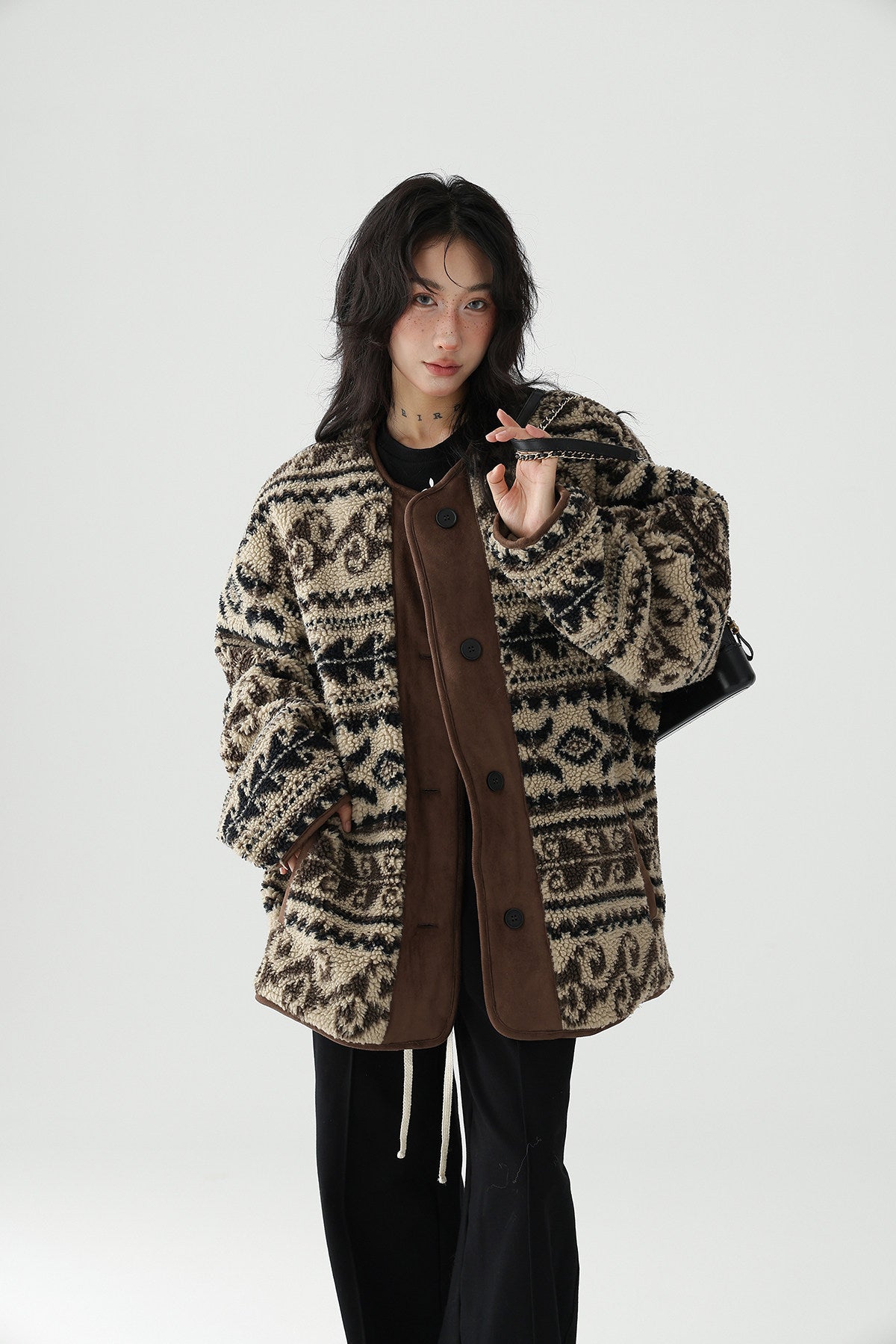 レトロなノルディック柄が冬のムードを高める、もこもこボアのニットカーディガン。