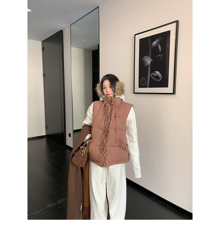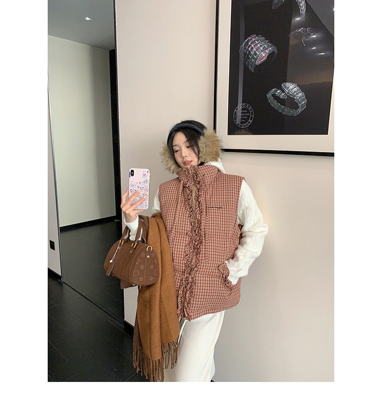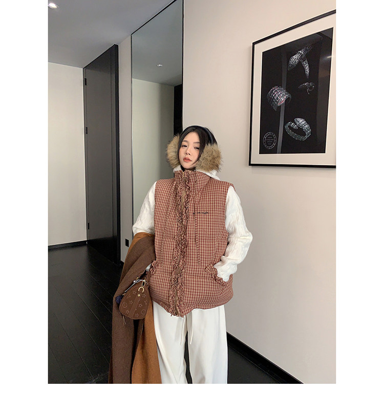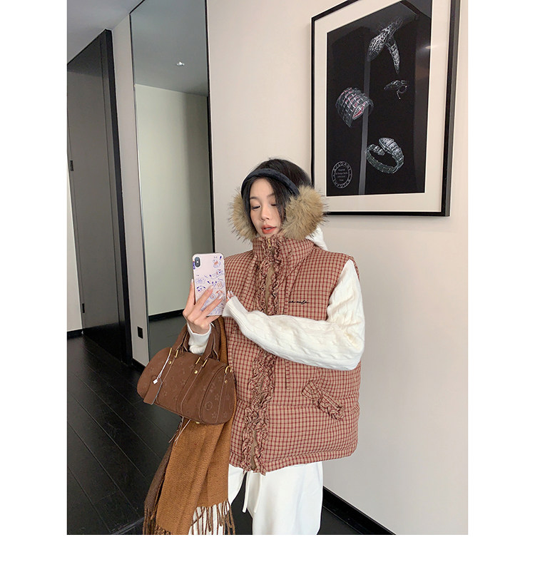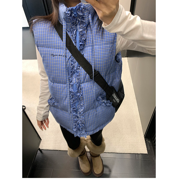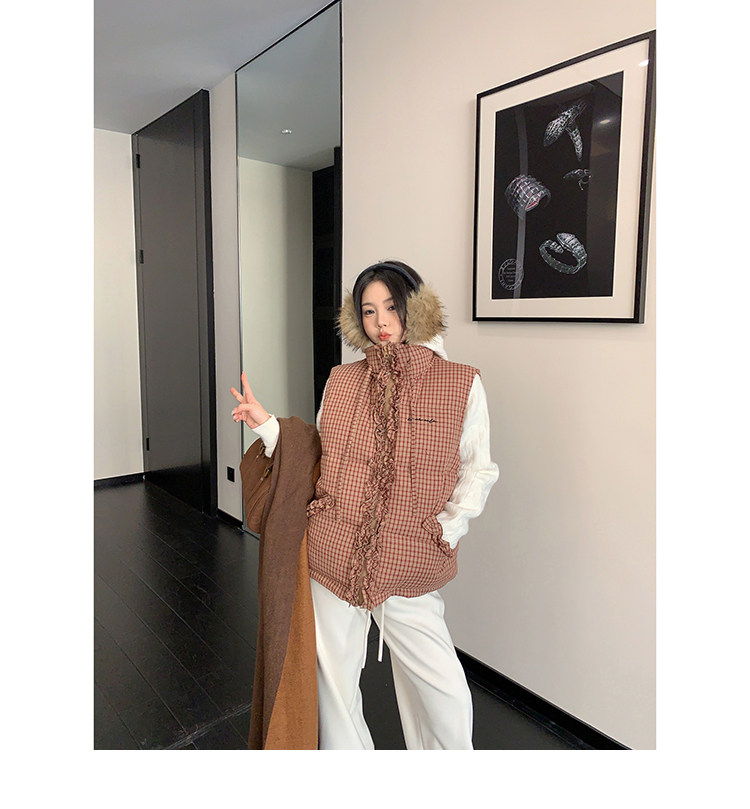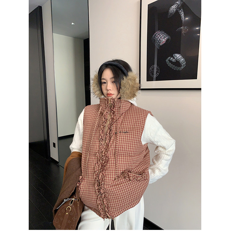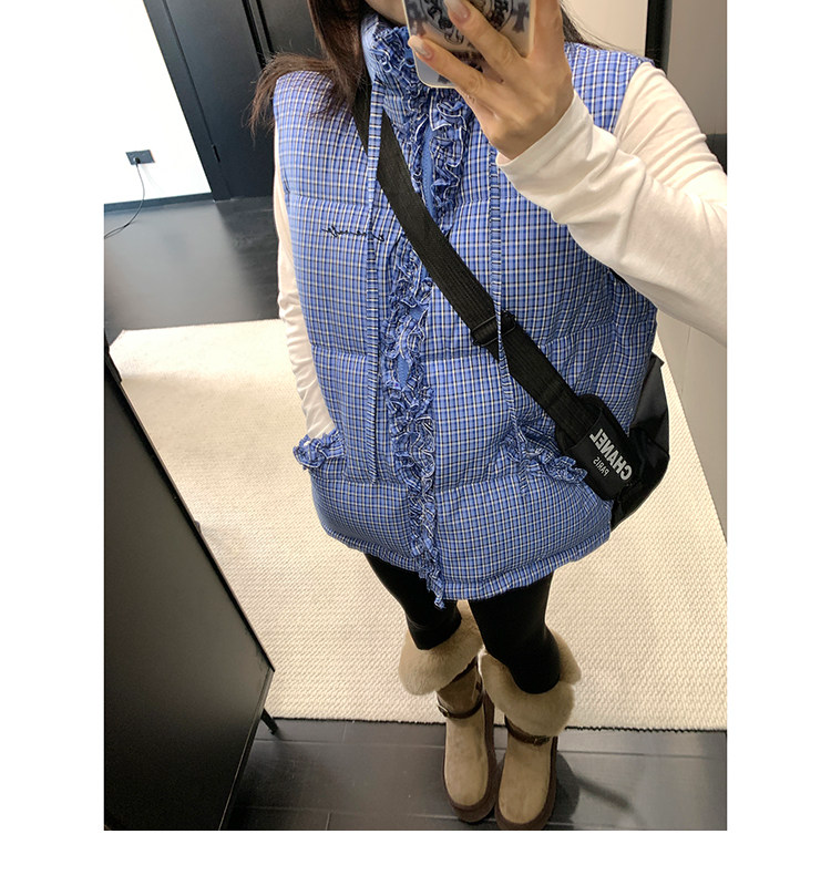 縦にあしらわれたフリルがガーリーなアクセントになった、チェック柄のダウンベスト。
