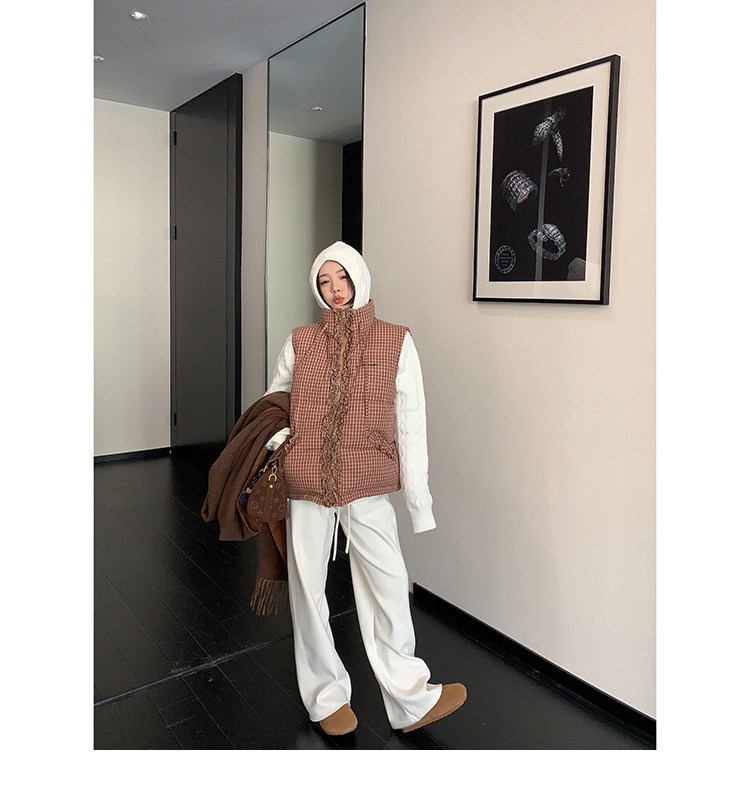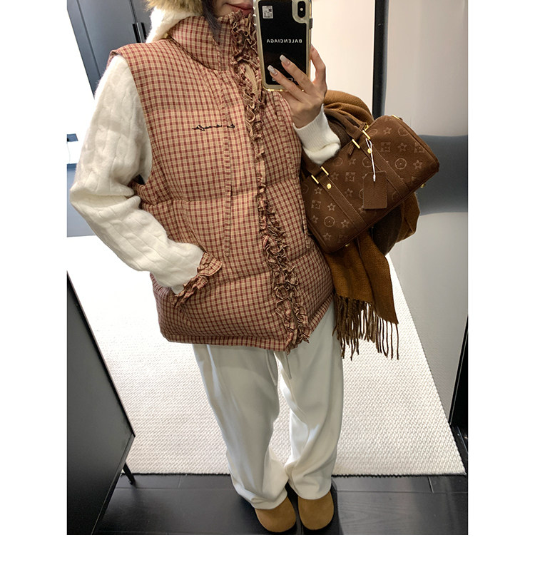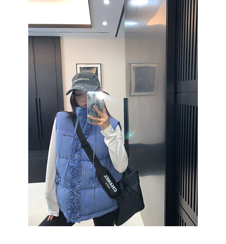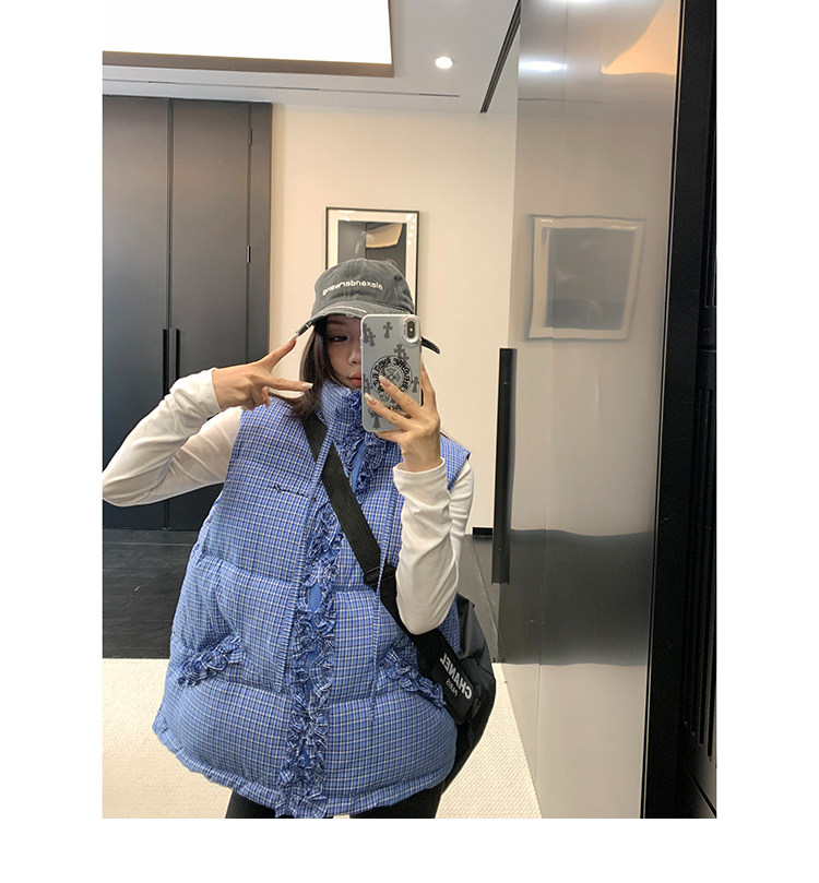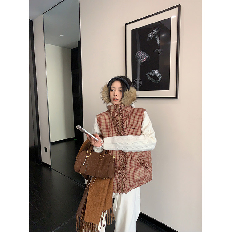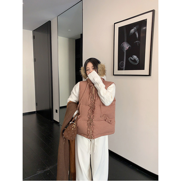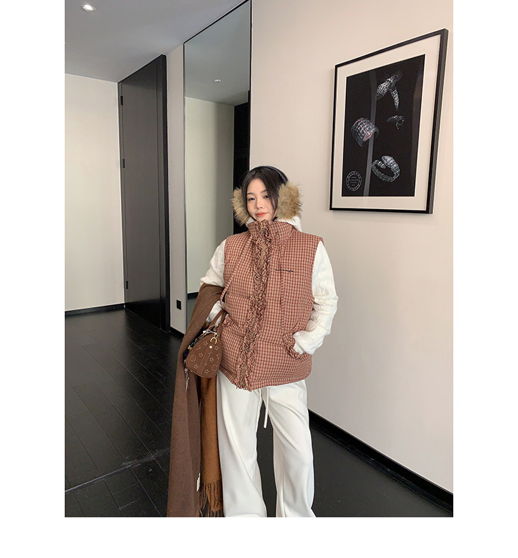 縦にあしらわれたフリルがガーリーなアクセントになった、チェック柄のダウンベスト。