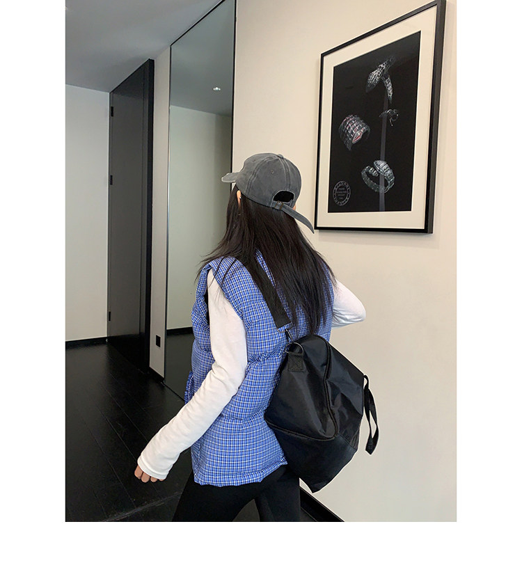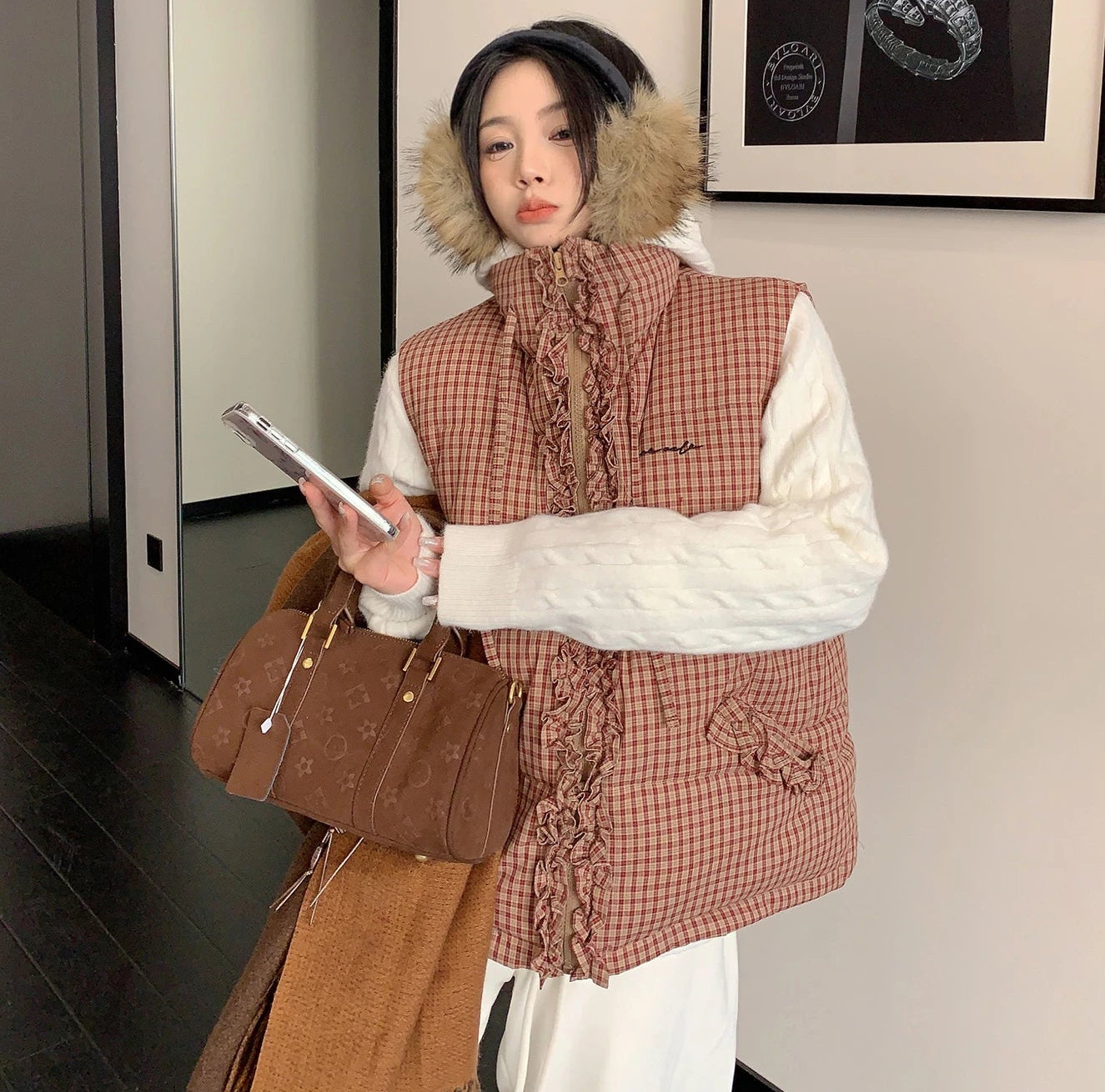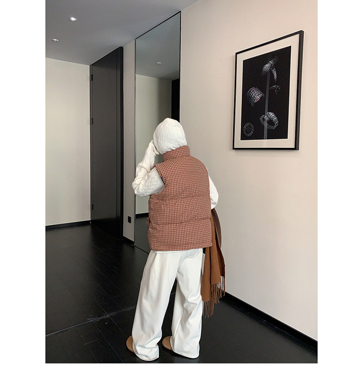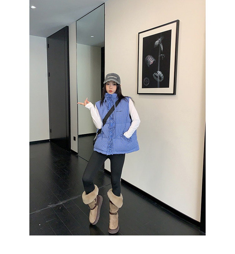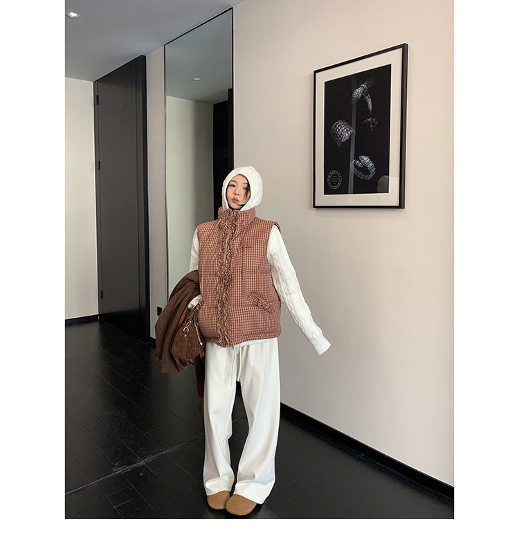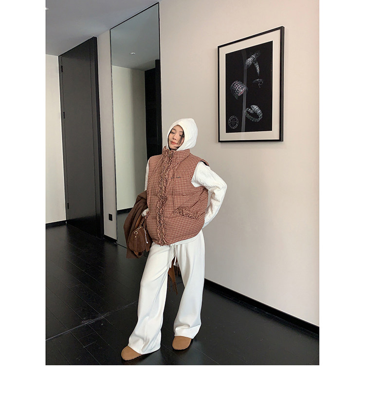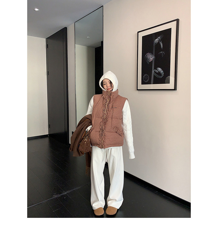 縦にあしらわれたフリルがガーリーなアクセントになった、チェック柄のダウンベスト。