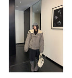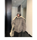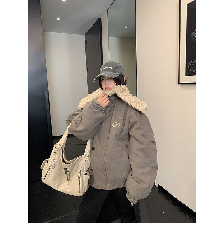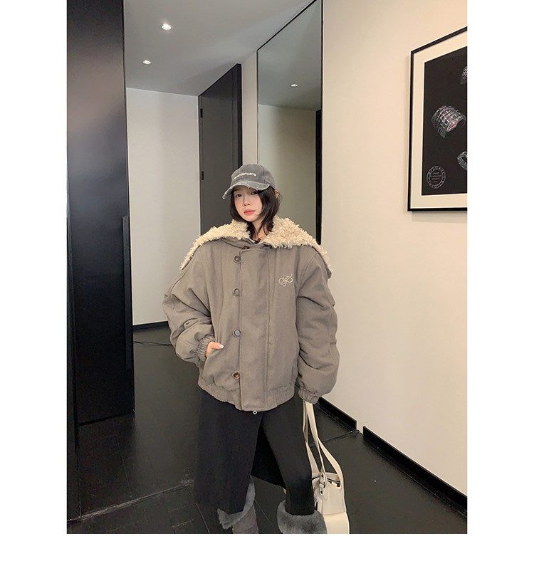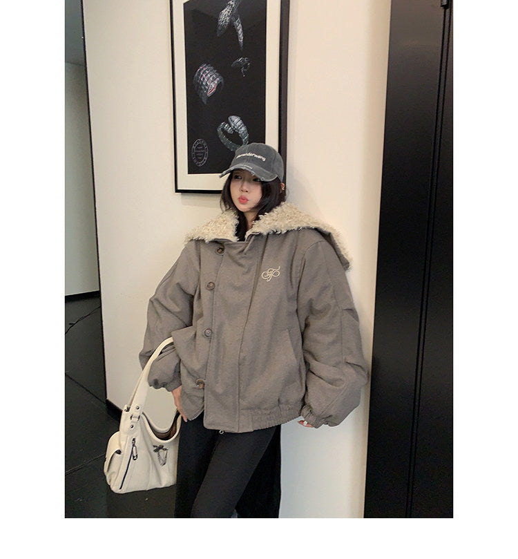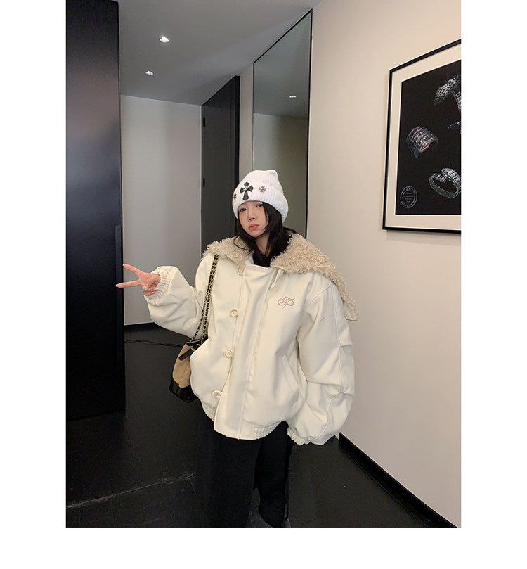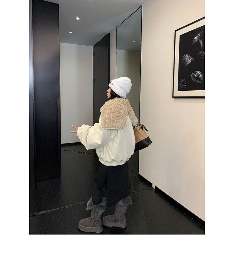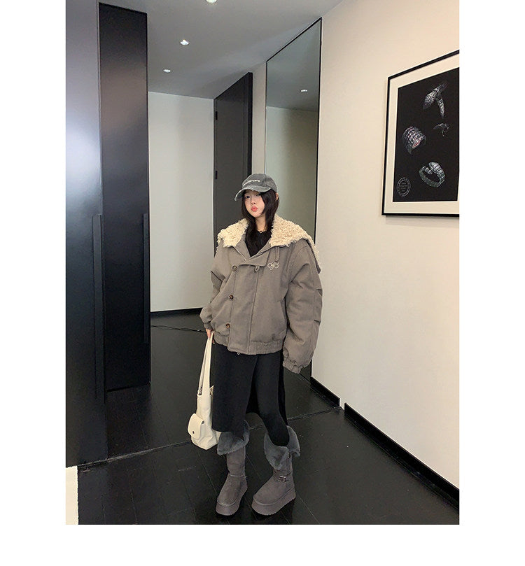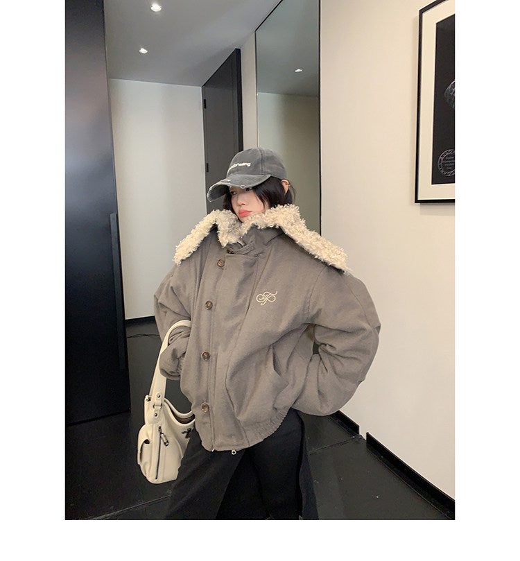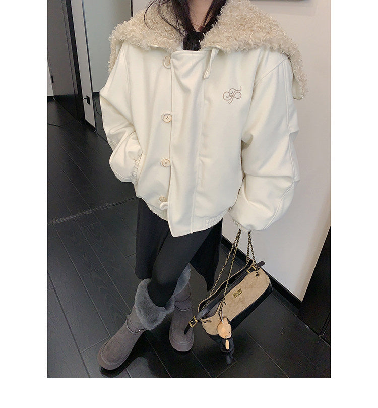 大きめのボア襟がアクセントになった、ショート丈ジャケット。