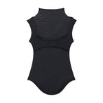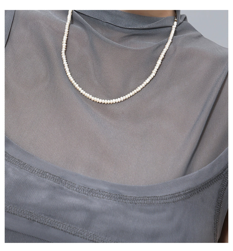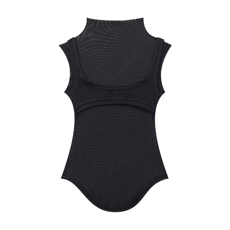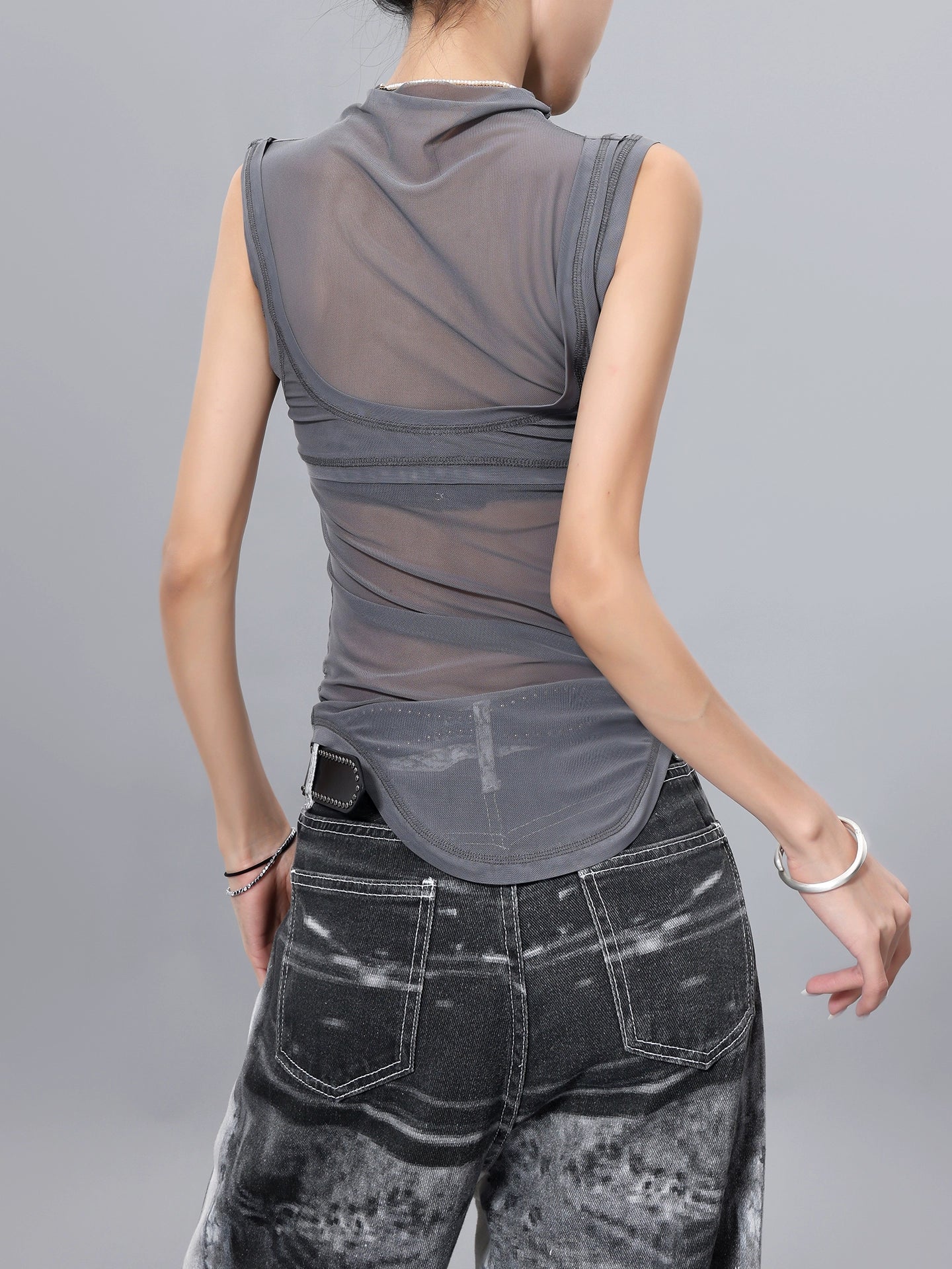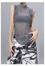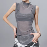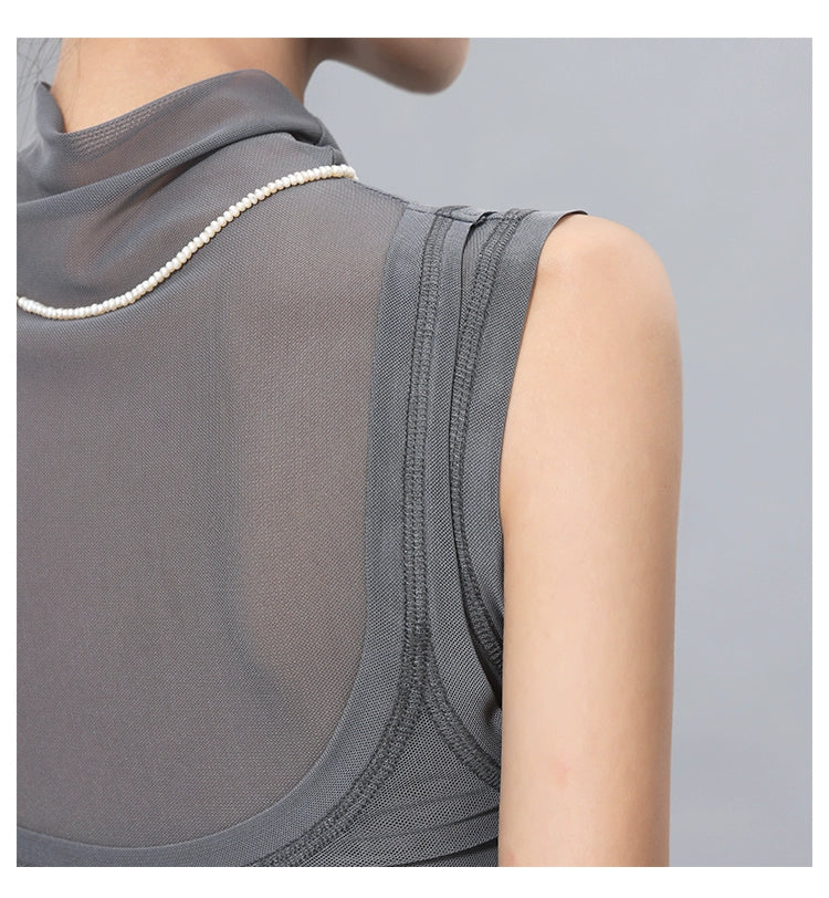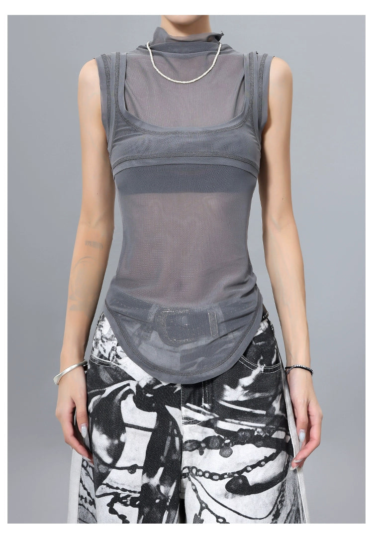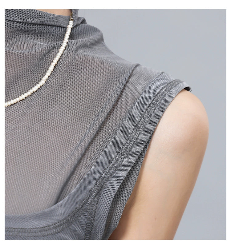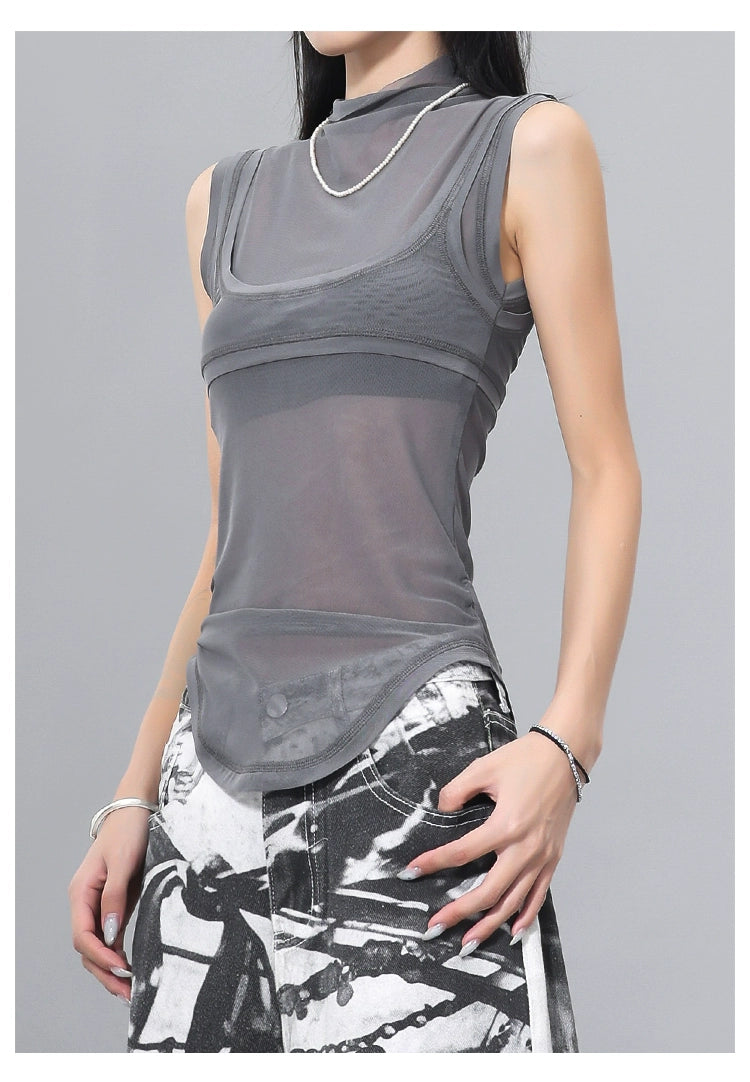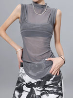 メッシュ素材を重ねた個性派ノースリトップス。