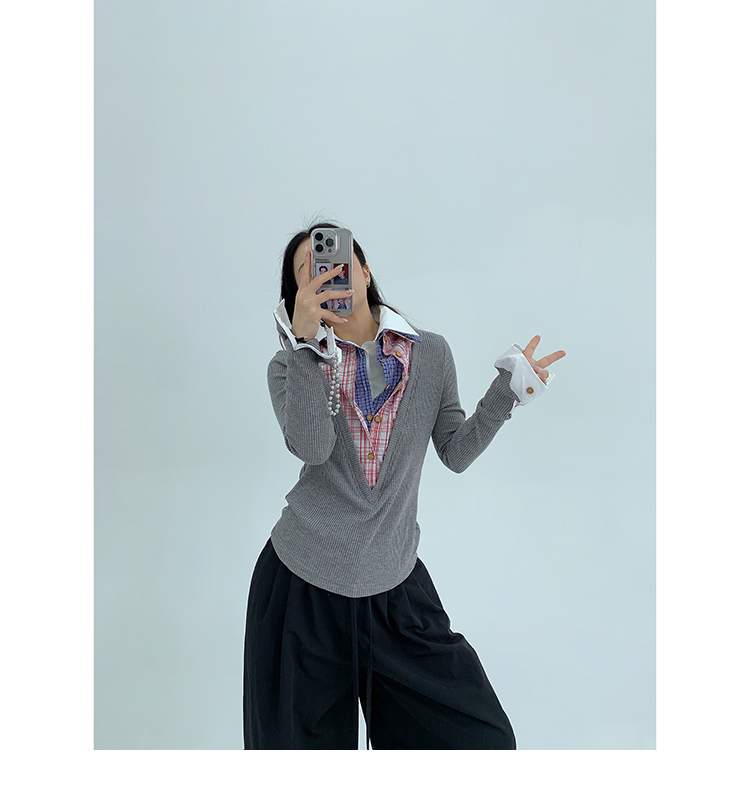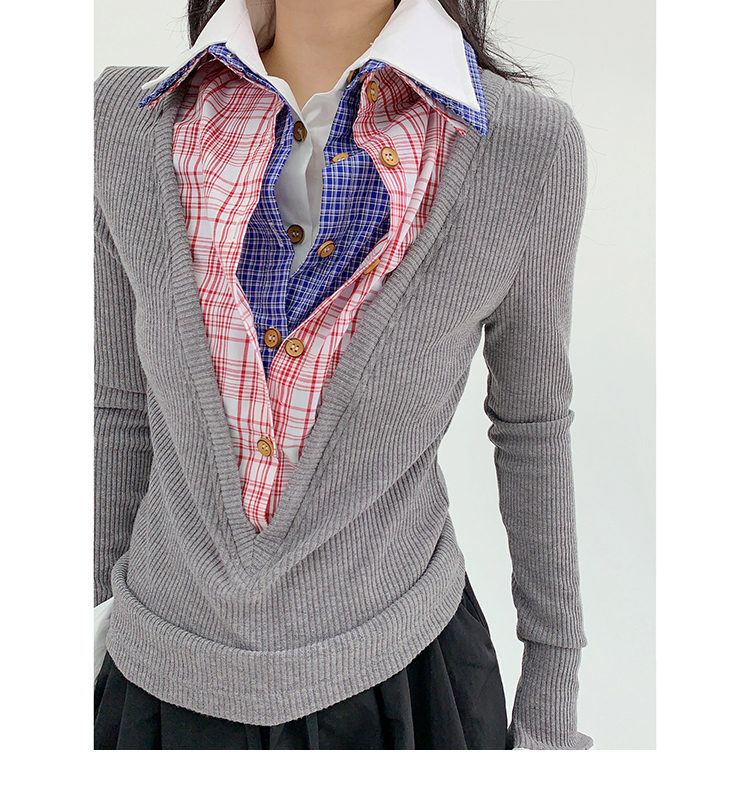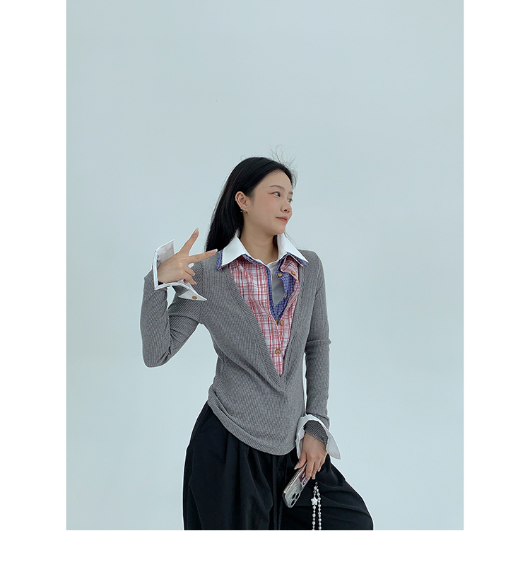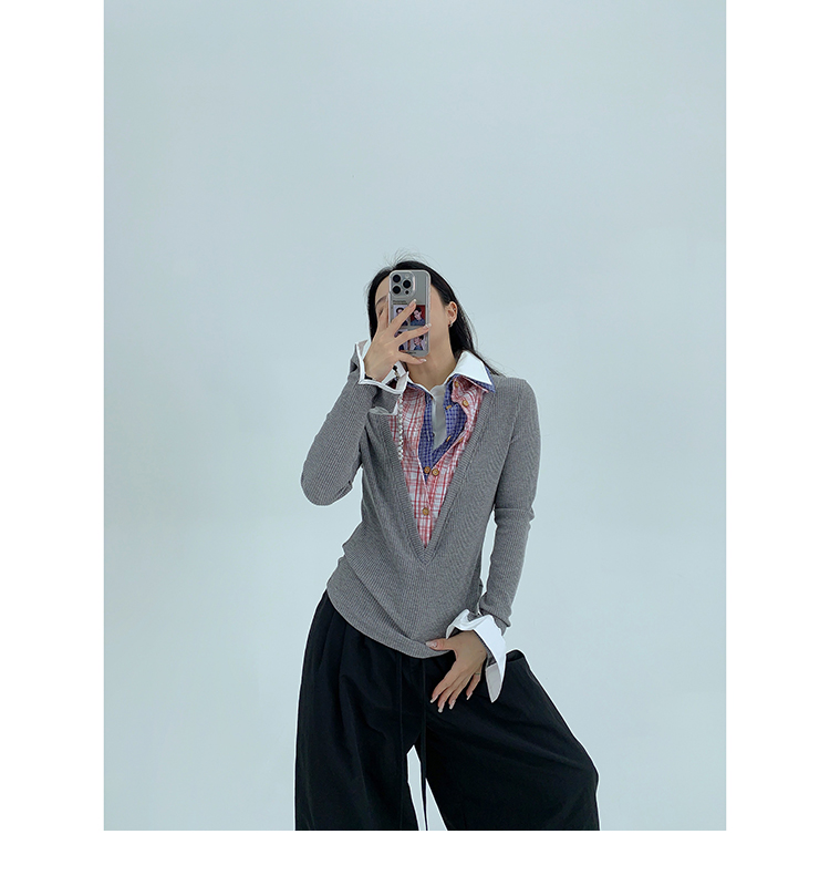 シャツを何枚も重ね着したような、ユニークなデザインのフェイクレイヤードニット。
