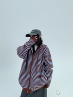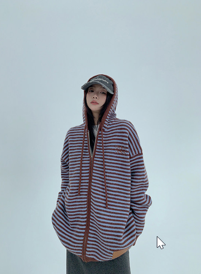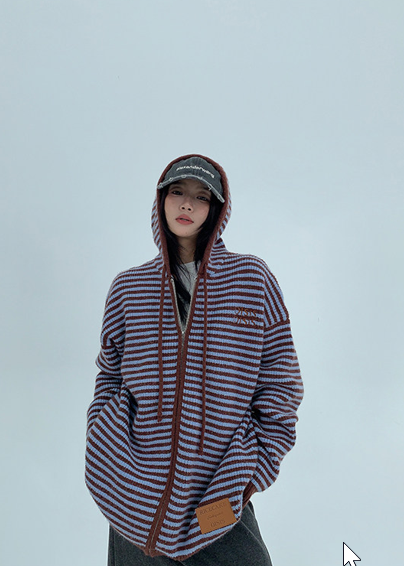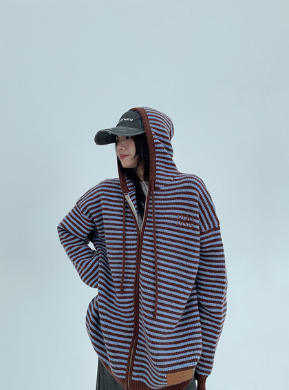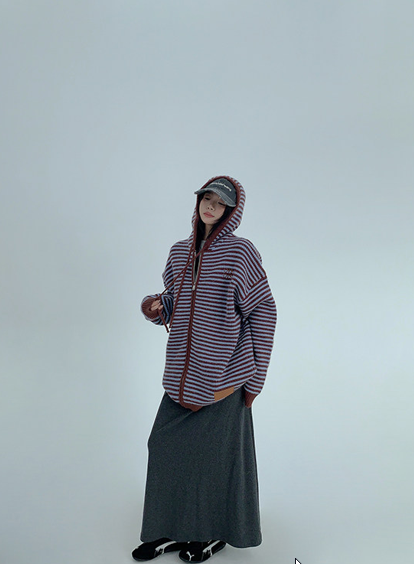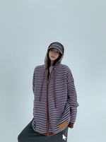 ゆるっと着られるオーバーサイズが可愛い、レトロな雰囲気のボーダー柄ニットパーカー。