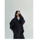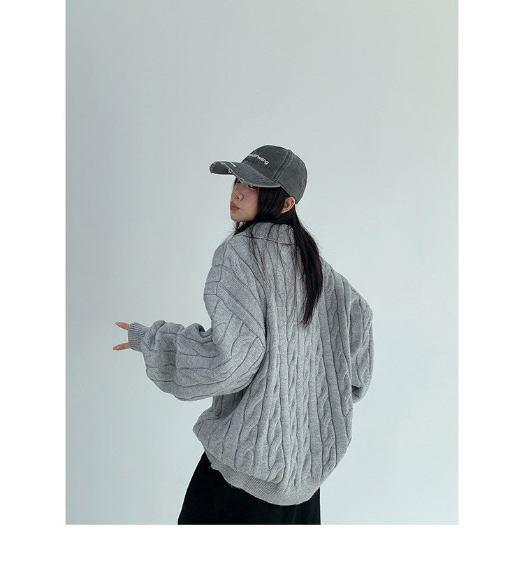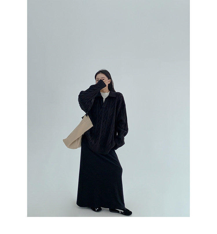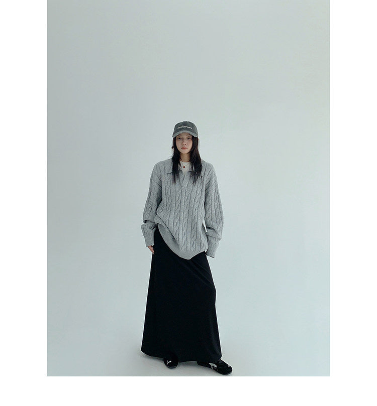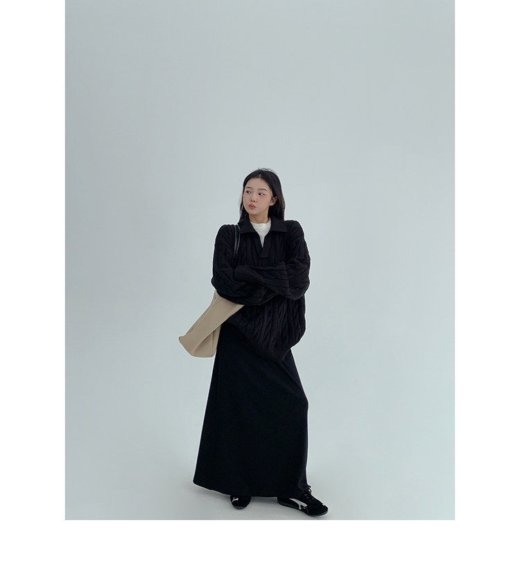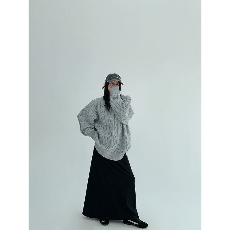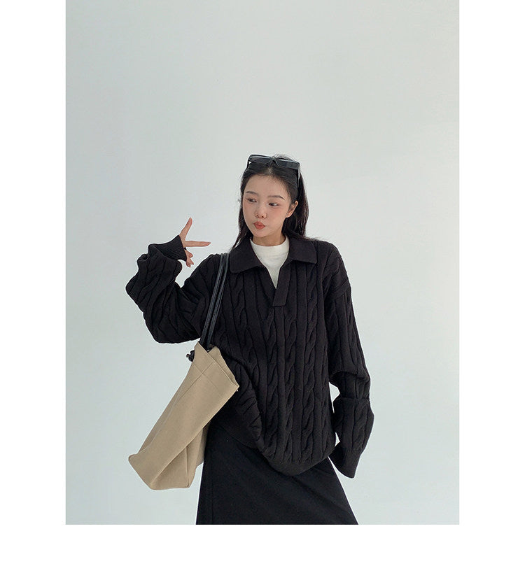 ざっくりとしたケーブル編みと襟付きデザインが今っぽい、主役級ニット。