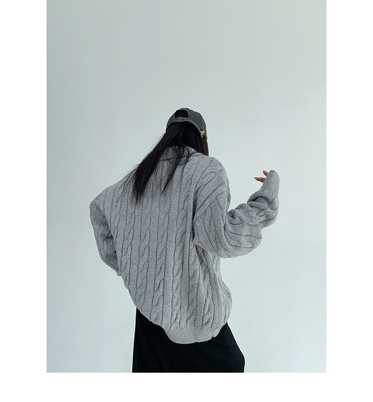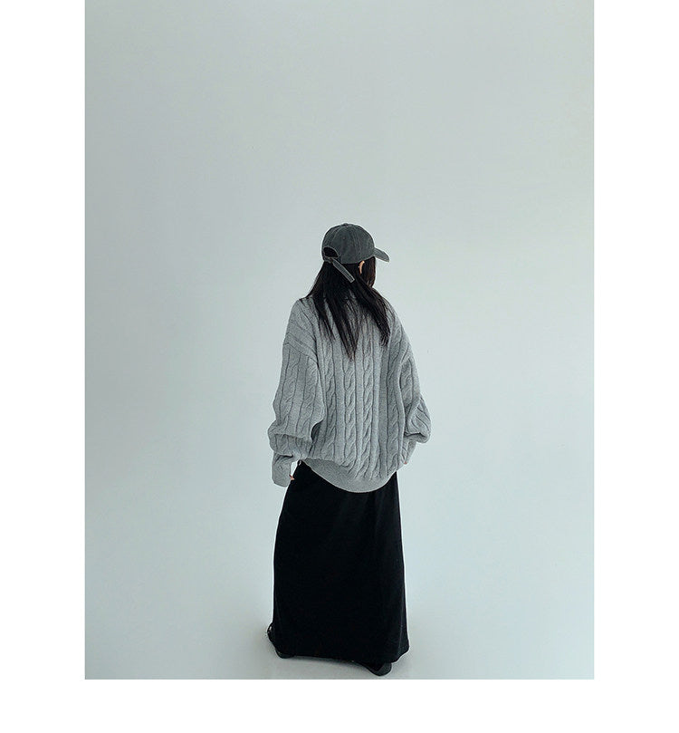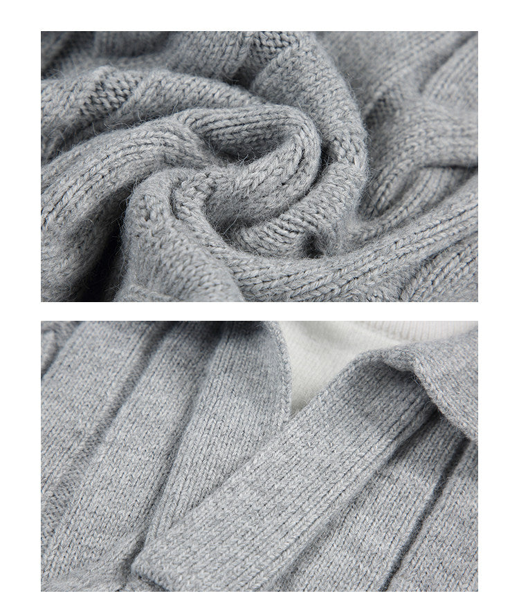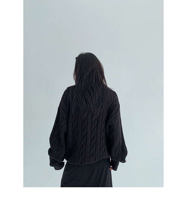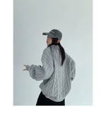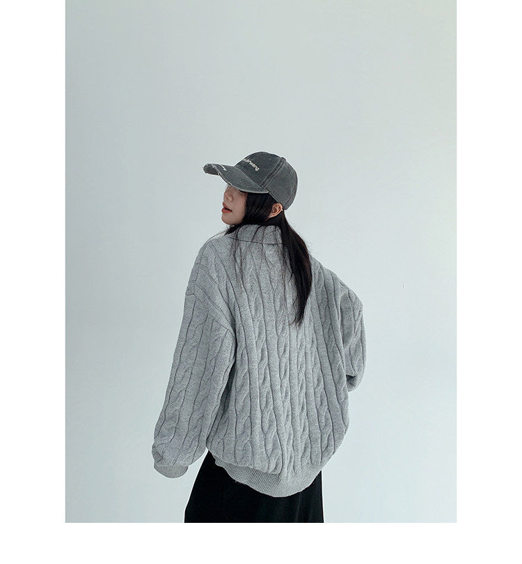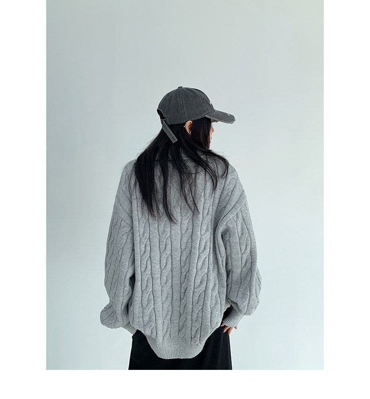 ざっくりとしたケーブル編みと襟付きデザインが今っぽい、主役級ニット。