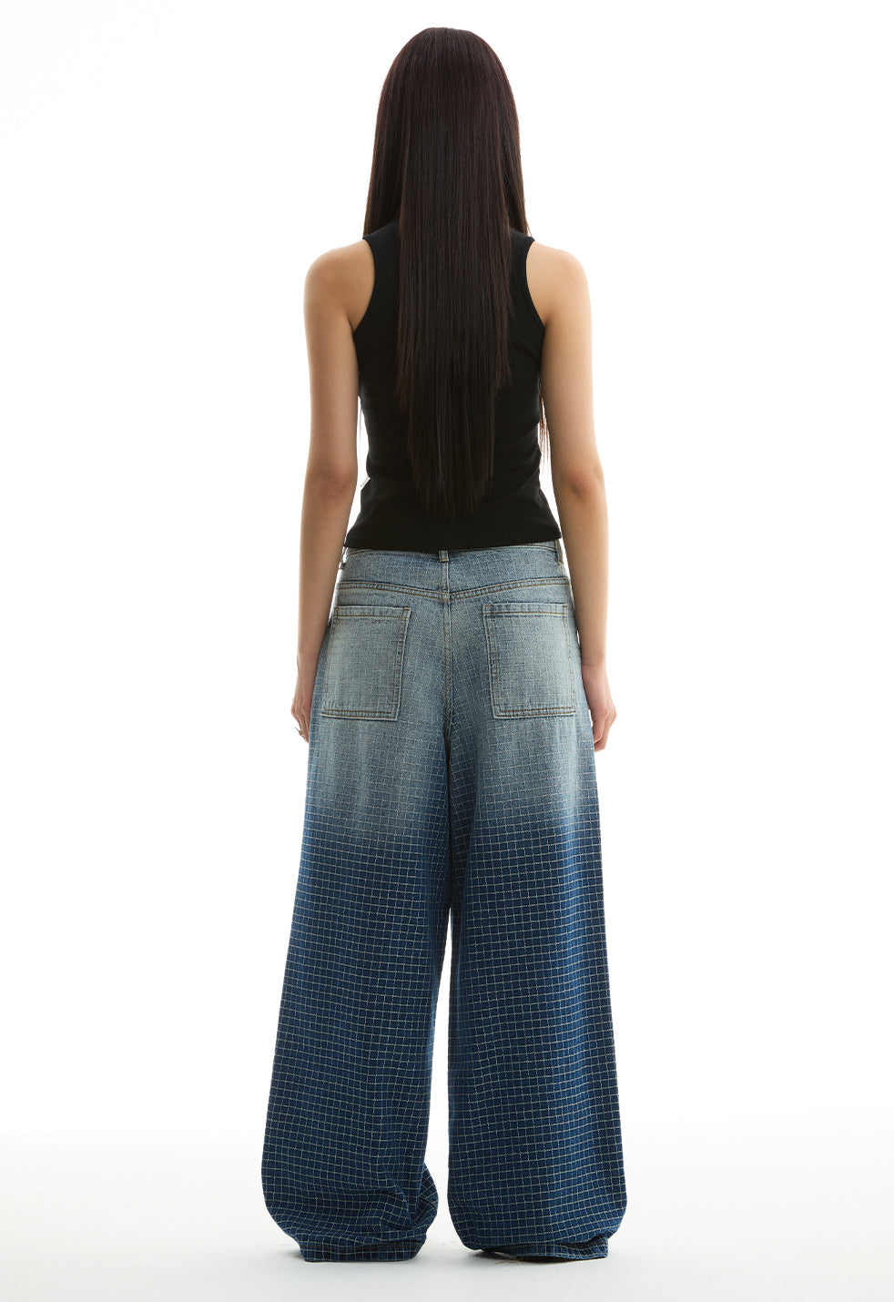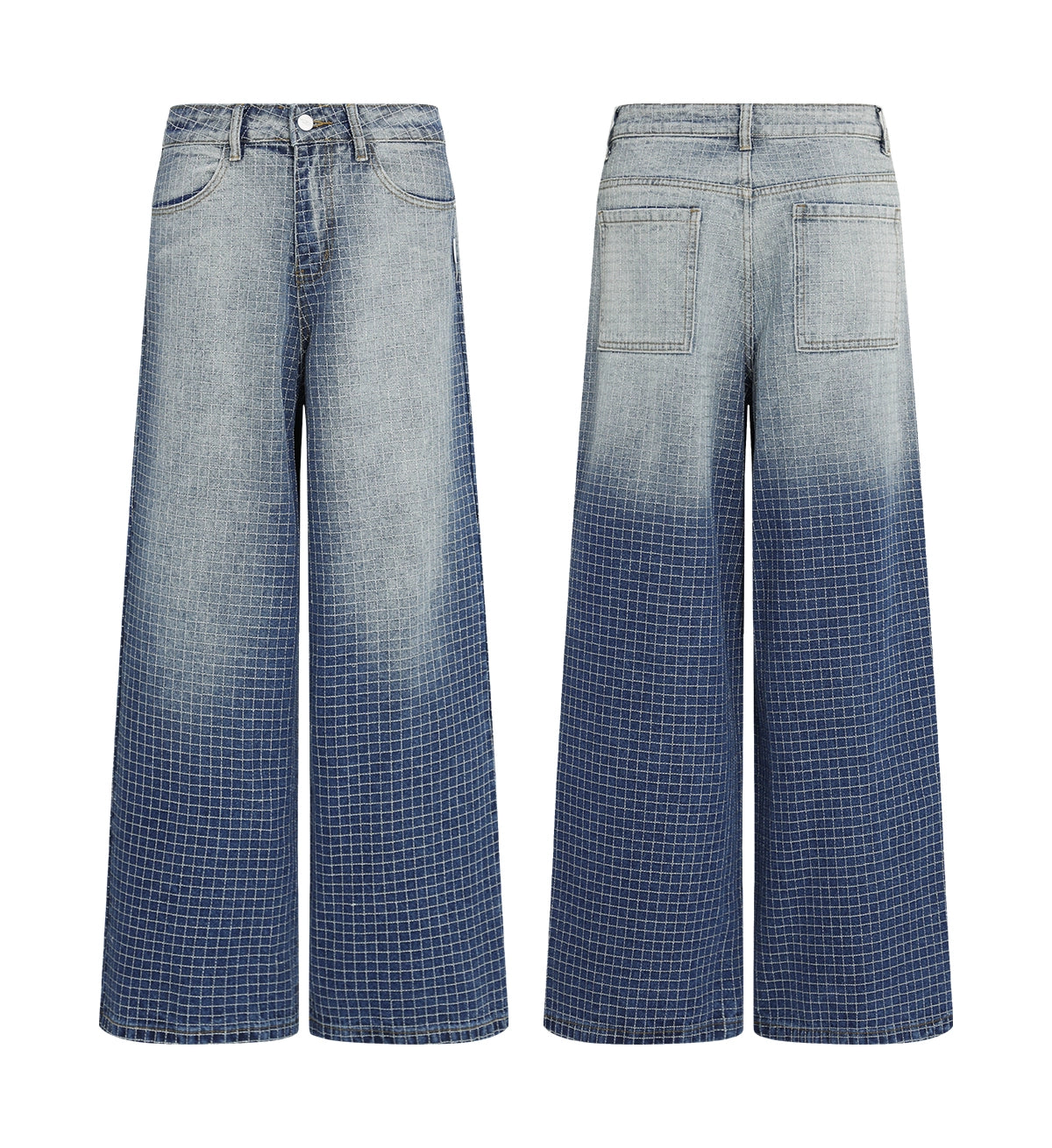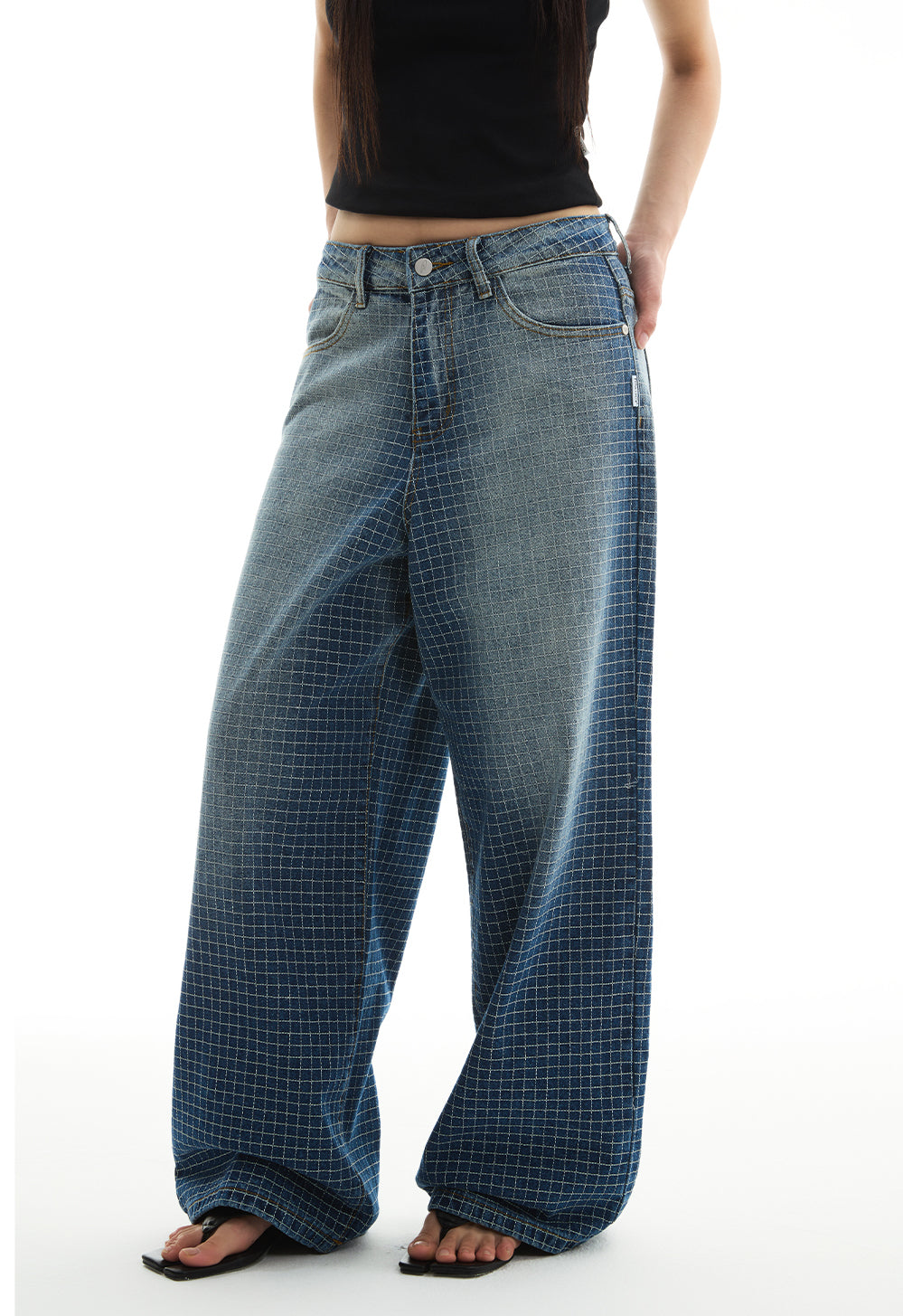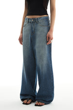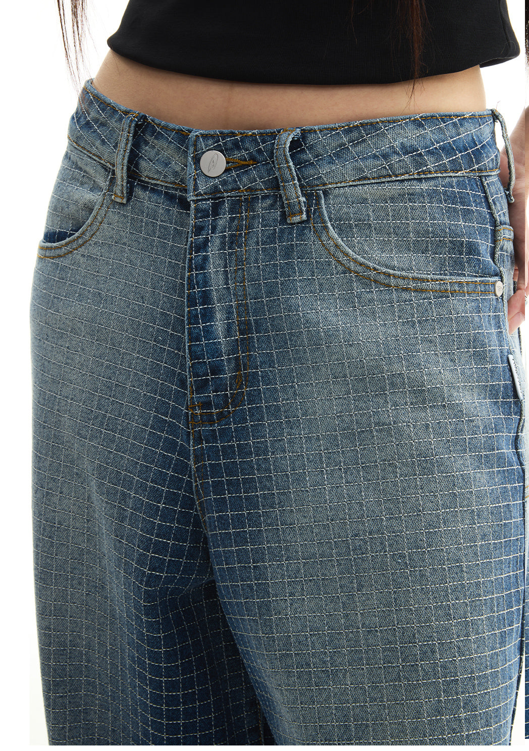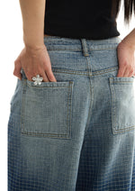 他にはない存在感抜群のグリッドデザインが目を惹くワイドデニムパンツ。
