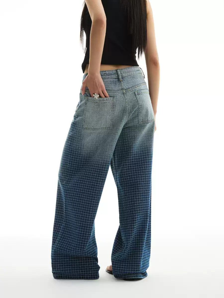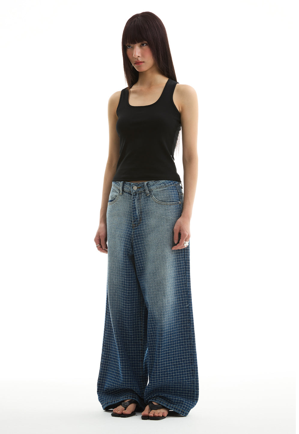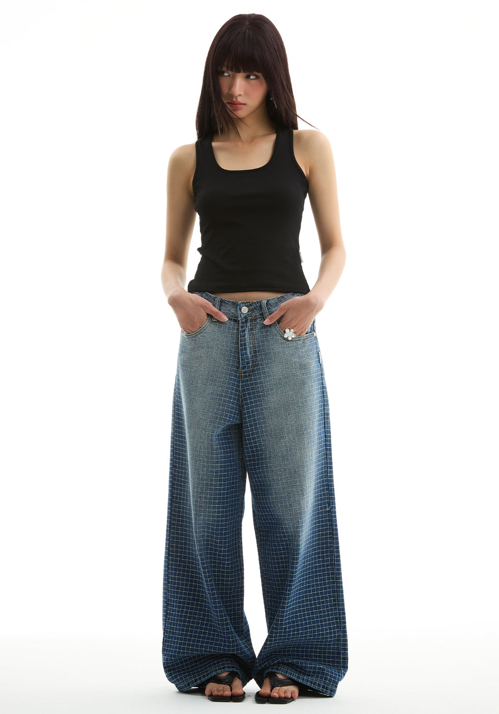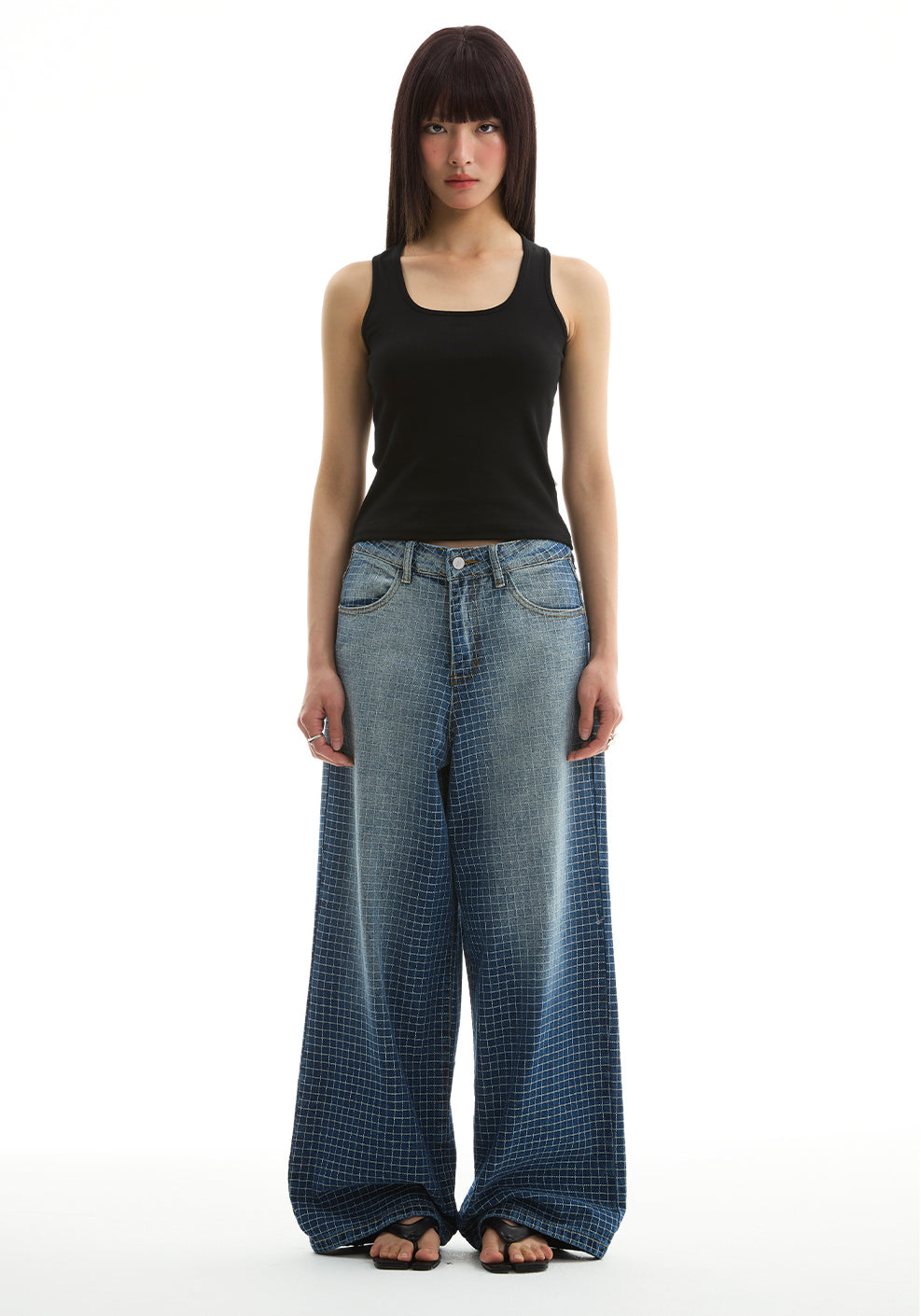 他にはない存在感抜群のグリッドデザインが目を惹くワイドデニムパンツ。