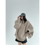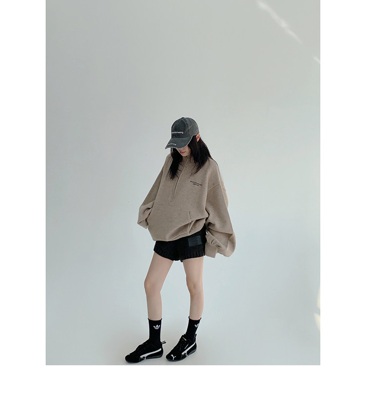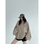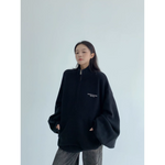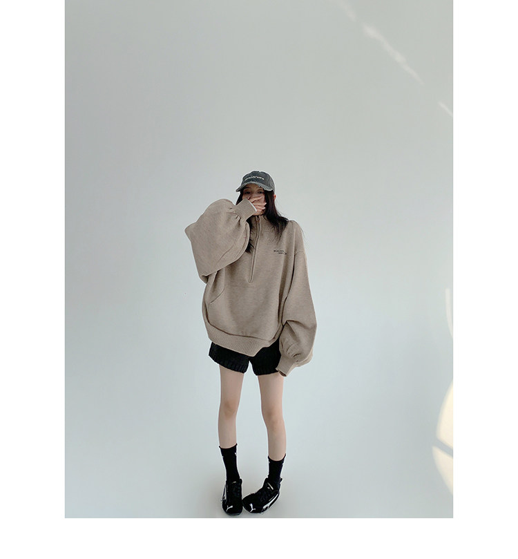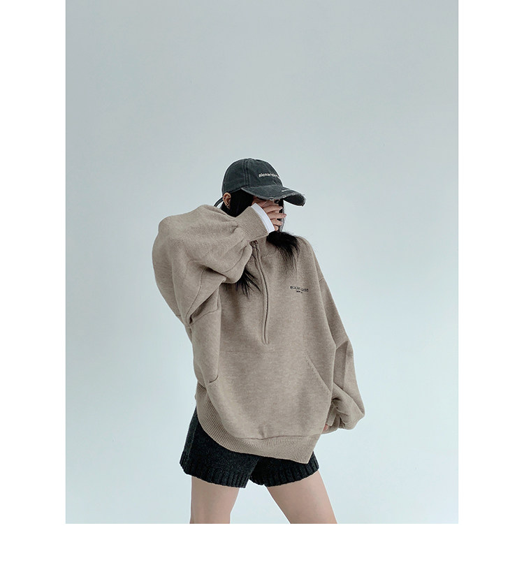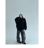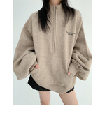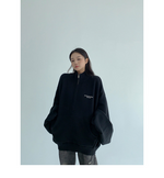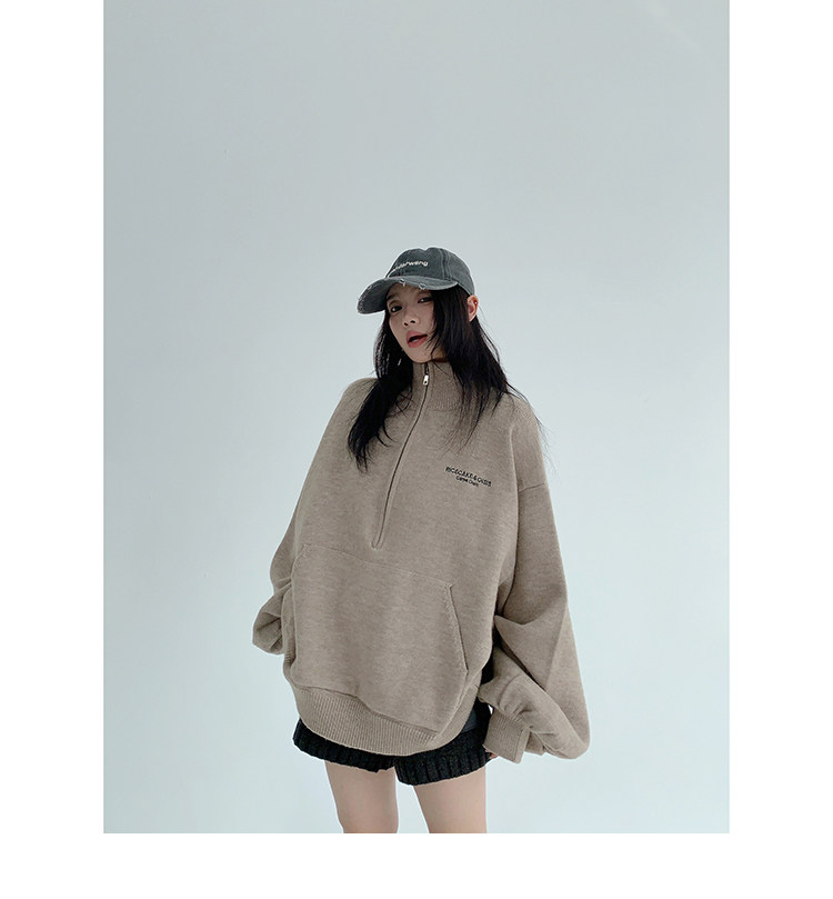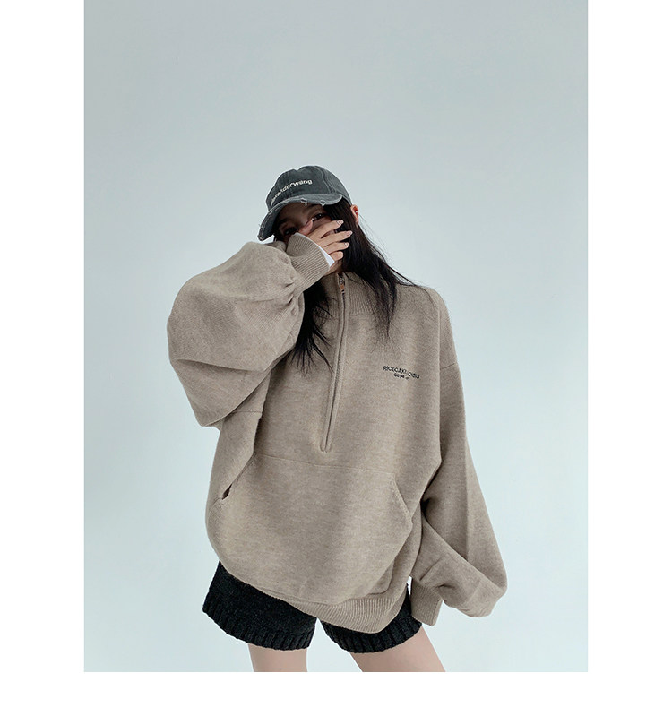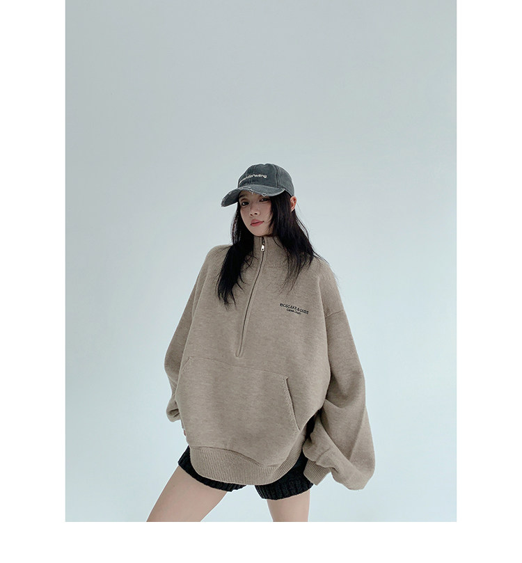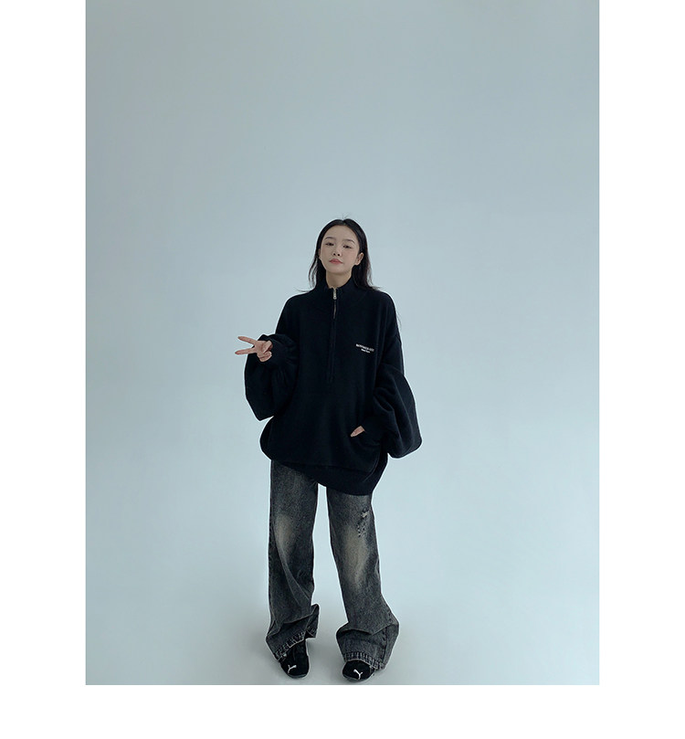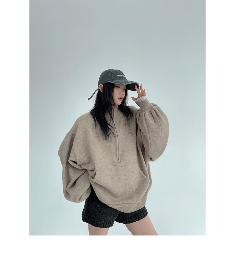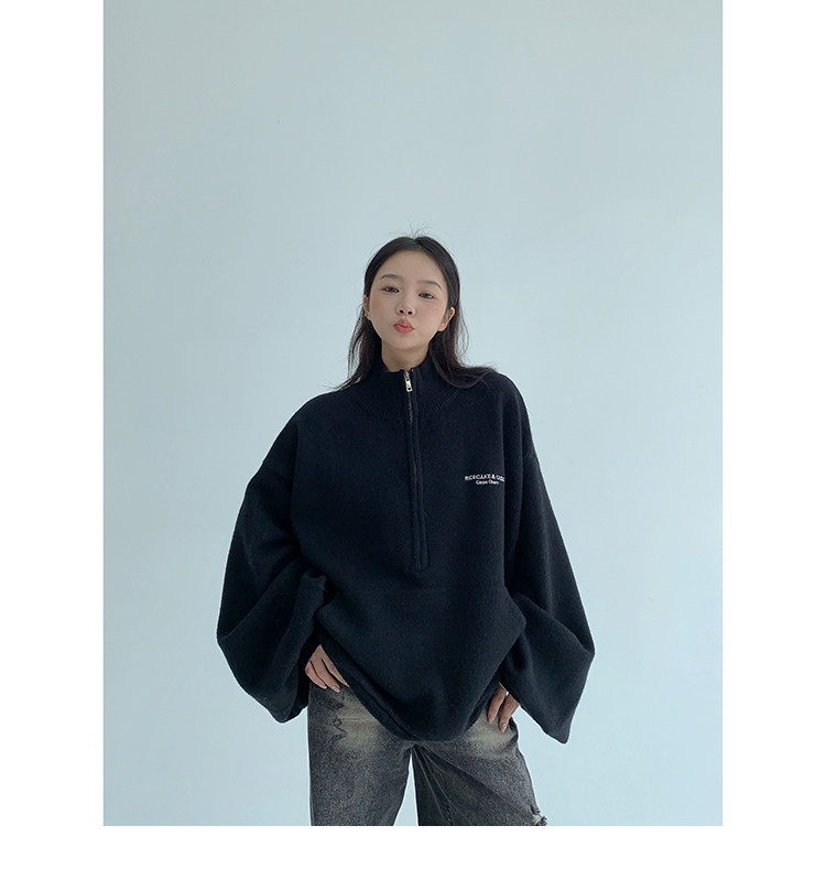 胸元のロゴ刺繍とハーフジップがアクセントになった、オーバーサイズのニットプルオーバー。