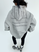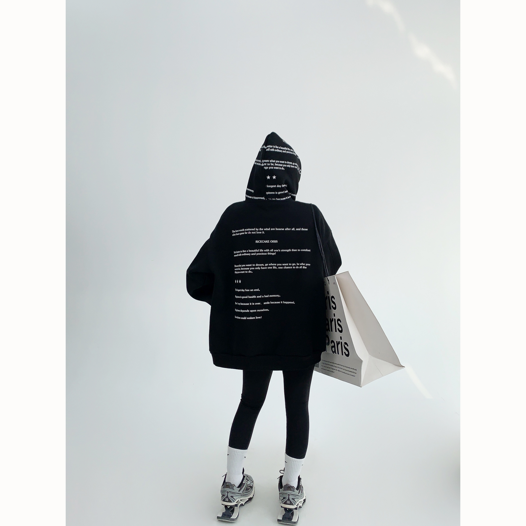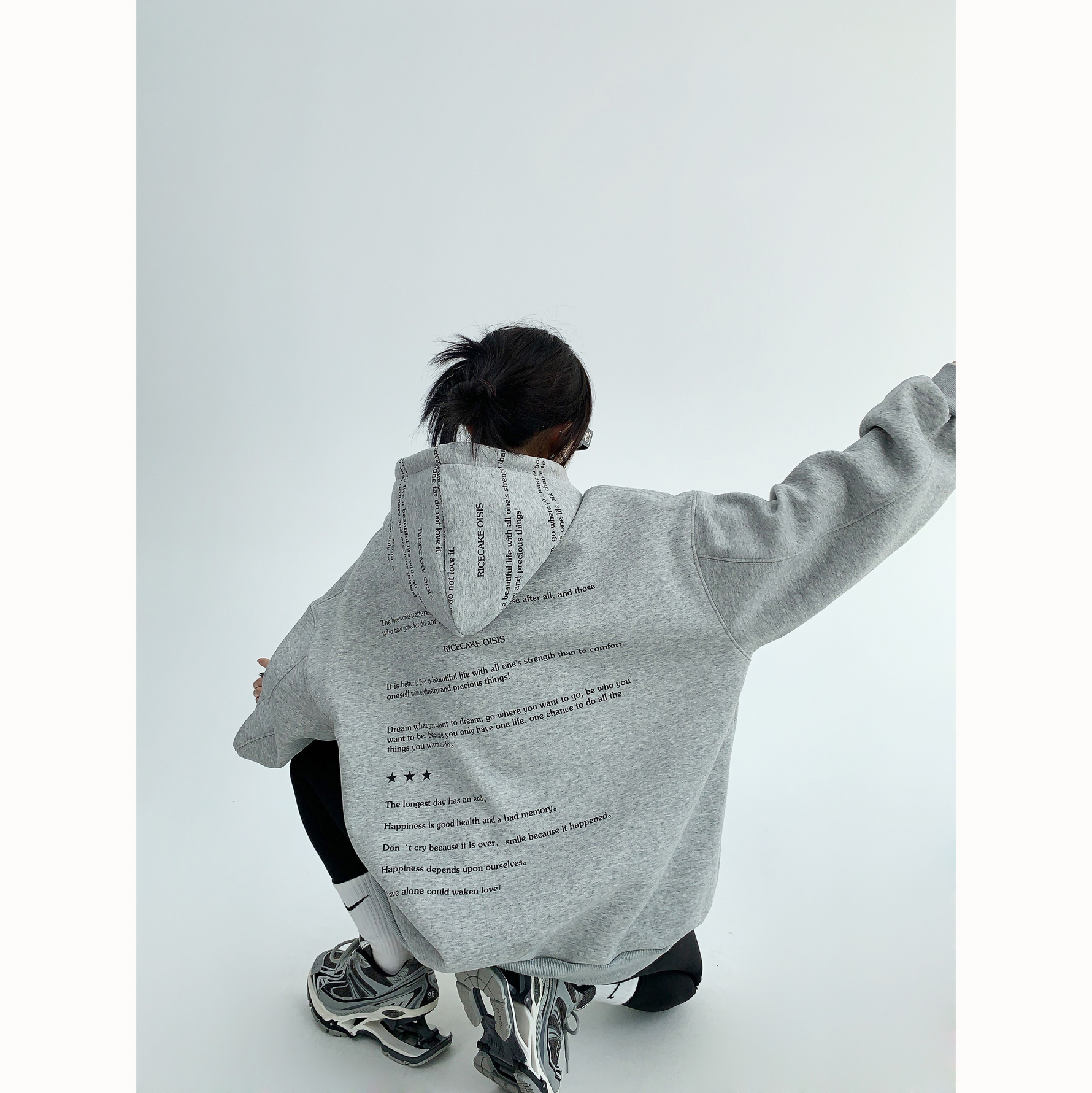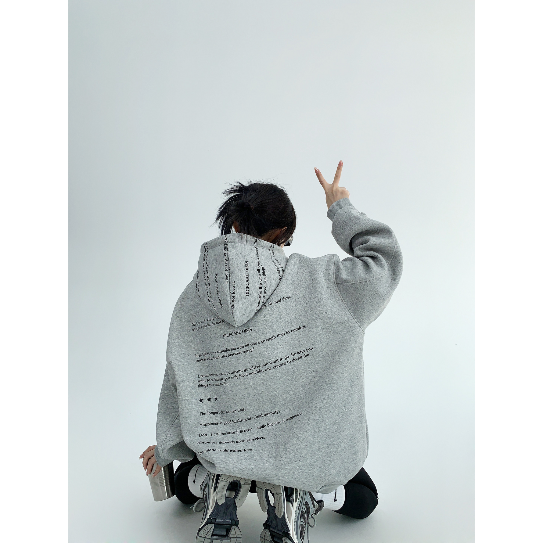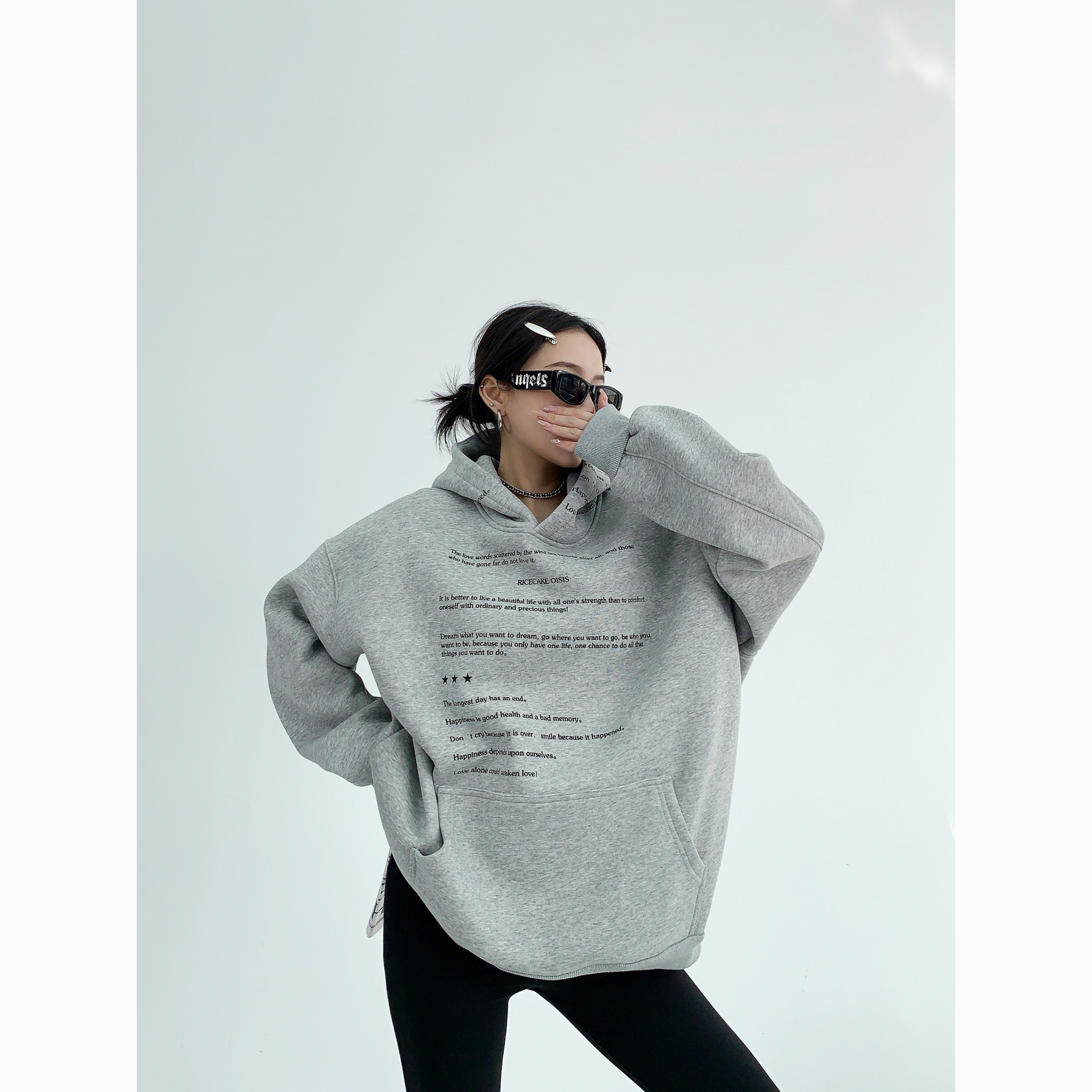 フロントからバック、フードに至るまでプリントされたメッセージロゴがインパクト抜群なフーディー。